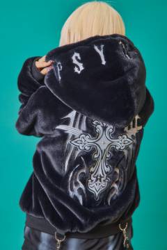 89915 PSYCHO NATION(サイコ・ネーション) トライバルクロス ファーフードブルゾン -Black × White