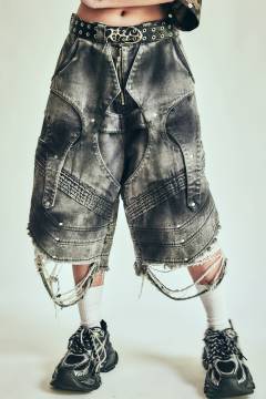 92737 P.N UNDERGROUND (サイコ・ネーション・アンダーグラウンド) 切替ダメージ・ハーフ・パンツ - デニム