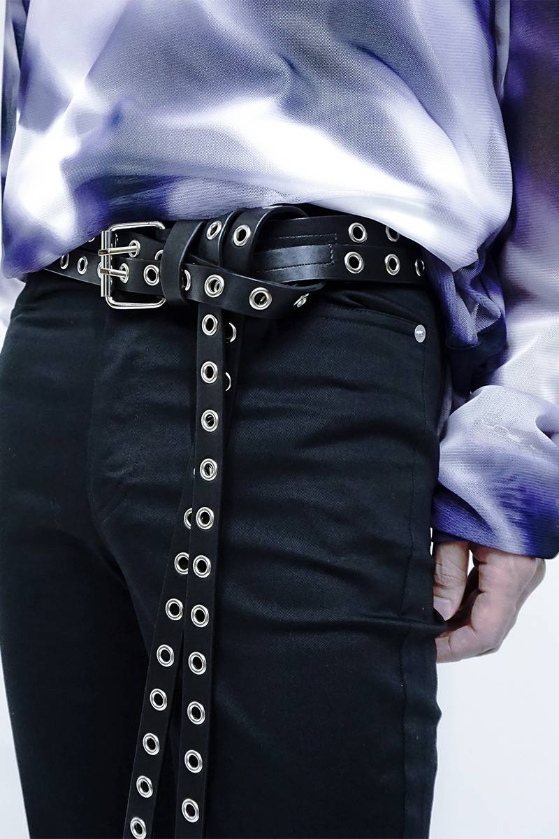 1本のベルトに3つのバックルが配置されたレザーロングベルトで