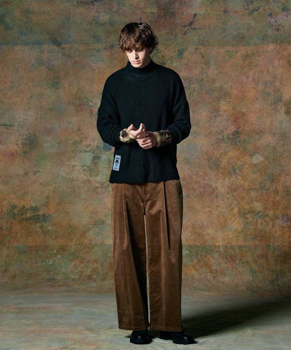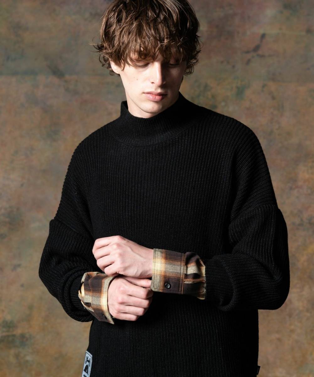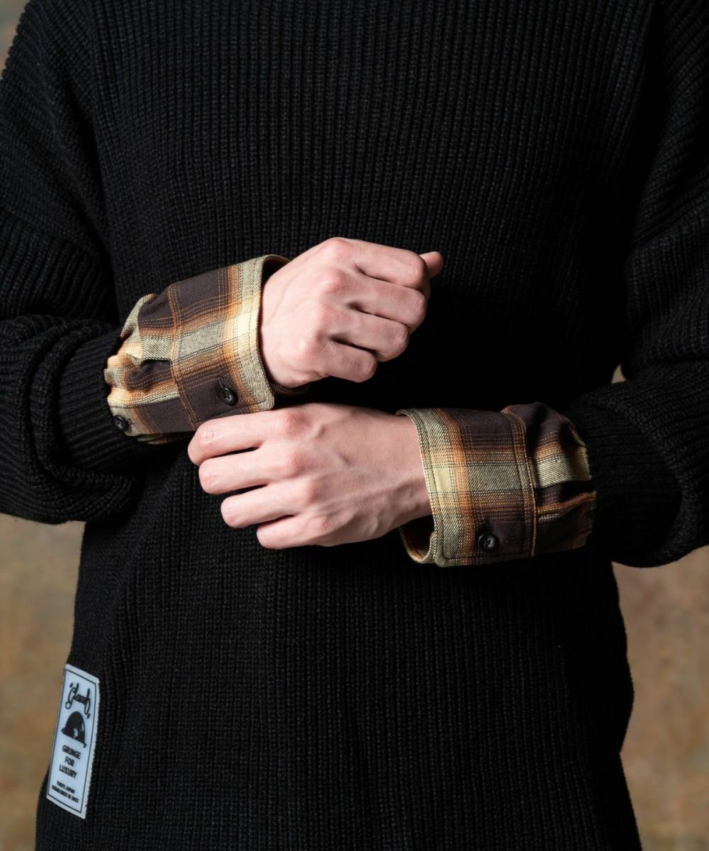 ブランドの得意とするフェイクレイヤードを用いてグランジとインテリジェンスを融合したトップススタイルを提案するCheck Layered Pullover Knit。アーバンな佇まいのモックネックボディは身幅にゆとりを持たせたルーズシルエット。その袖口にフェイク仕様であしらわれたチェックシャツパーツは数ロールまくったアレンジもおすすめ。裾にはラバータグをあしらい、フェイクレイヤードの上に更なる異素材レイヤードを加えた重層的な仕上がりの1枚です。