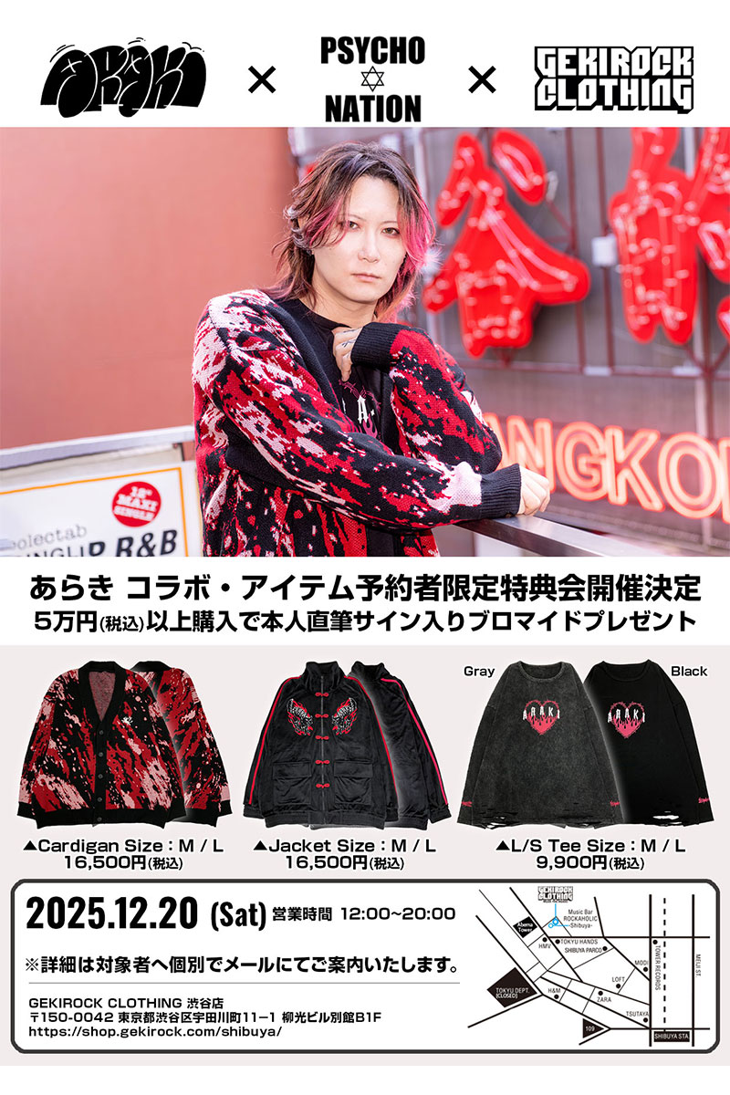 さらに本コラボ・アイテムを1注文内で5万円(税込)以上ご予約の方は2025年12月20日(土)GEKIROCK CLOTHING渋谷店にてあらき特典会イベントに参加可能!