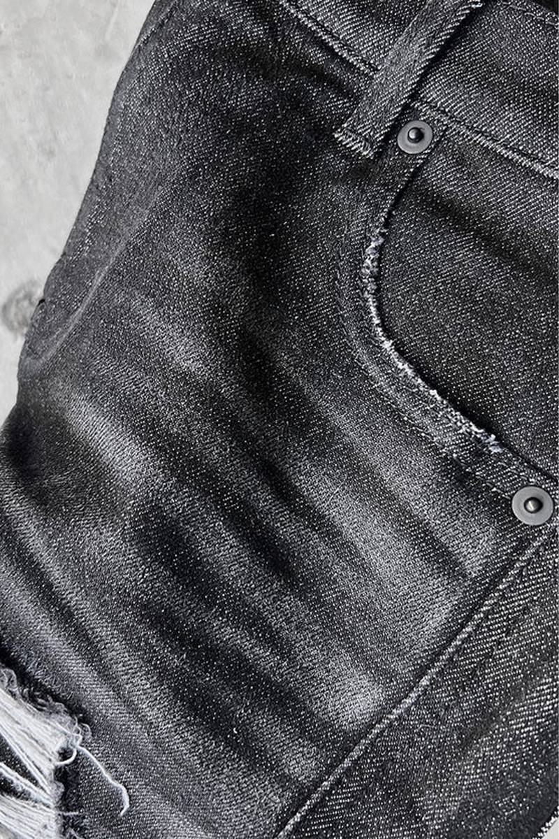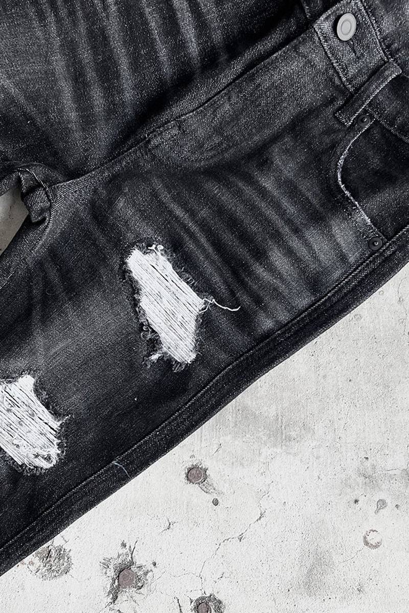 Strech cクラッシュの加工も大きく変更し、腿周りは後ろから当て布を付けクラッシュの横糸が千切れても肌が露骨に見えないように、