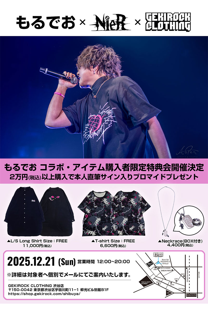さらに本コラボ・アイテムを1注文内で2万円以上ご予約の方は2025年12月21日(日)GEKIROCK CLOTHING渋谷店にてもるでお特典会イベントに参加可能!