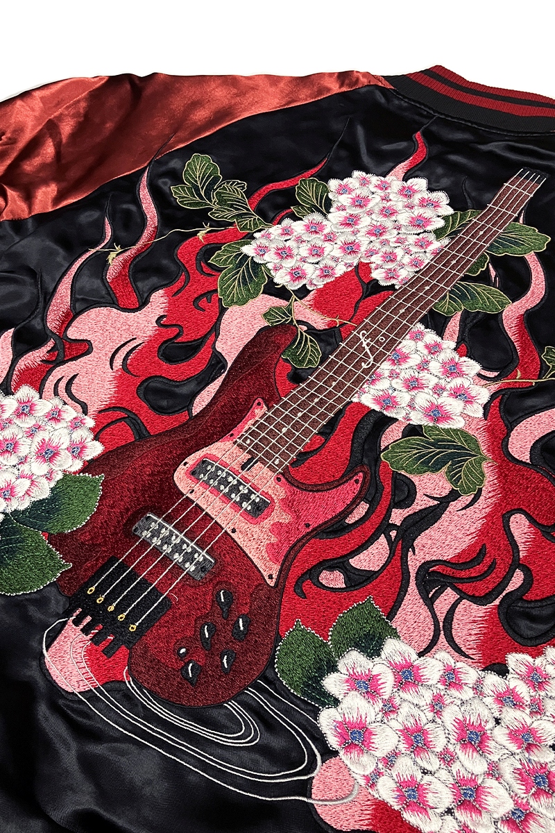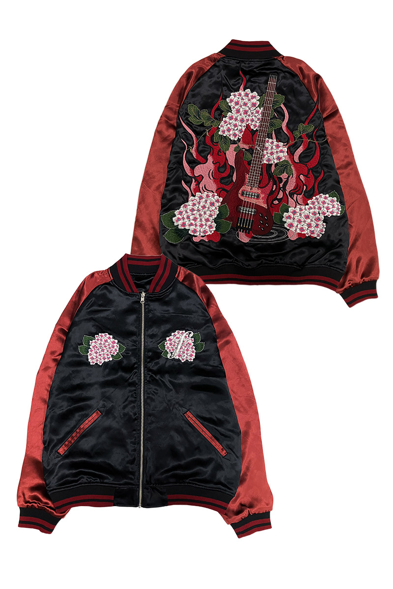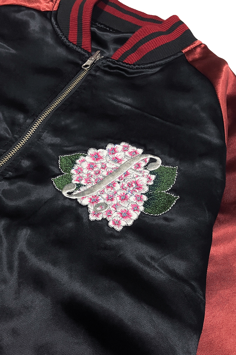 バックには本人のシグネイチャーベースをメインに紫陽花を散りばめた華やかさと力強さを落とし込んだ特大豪華刺繍を落とし込みました。