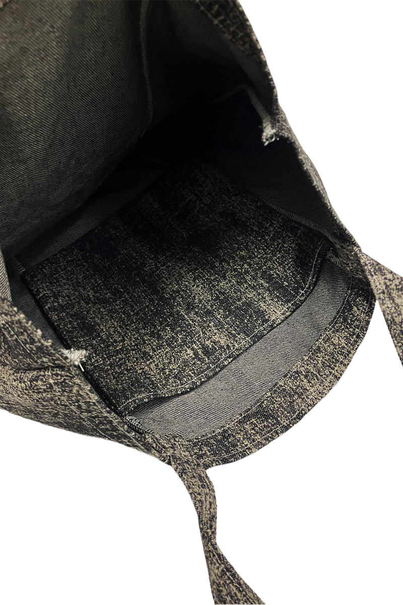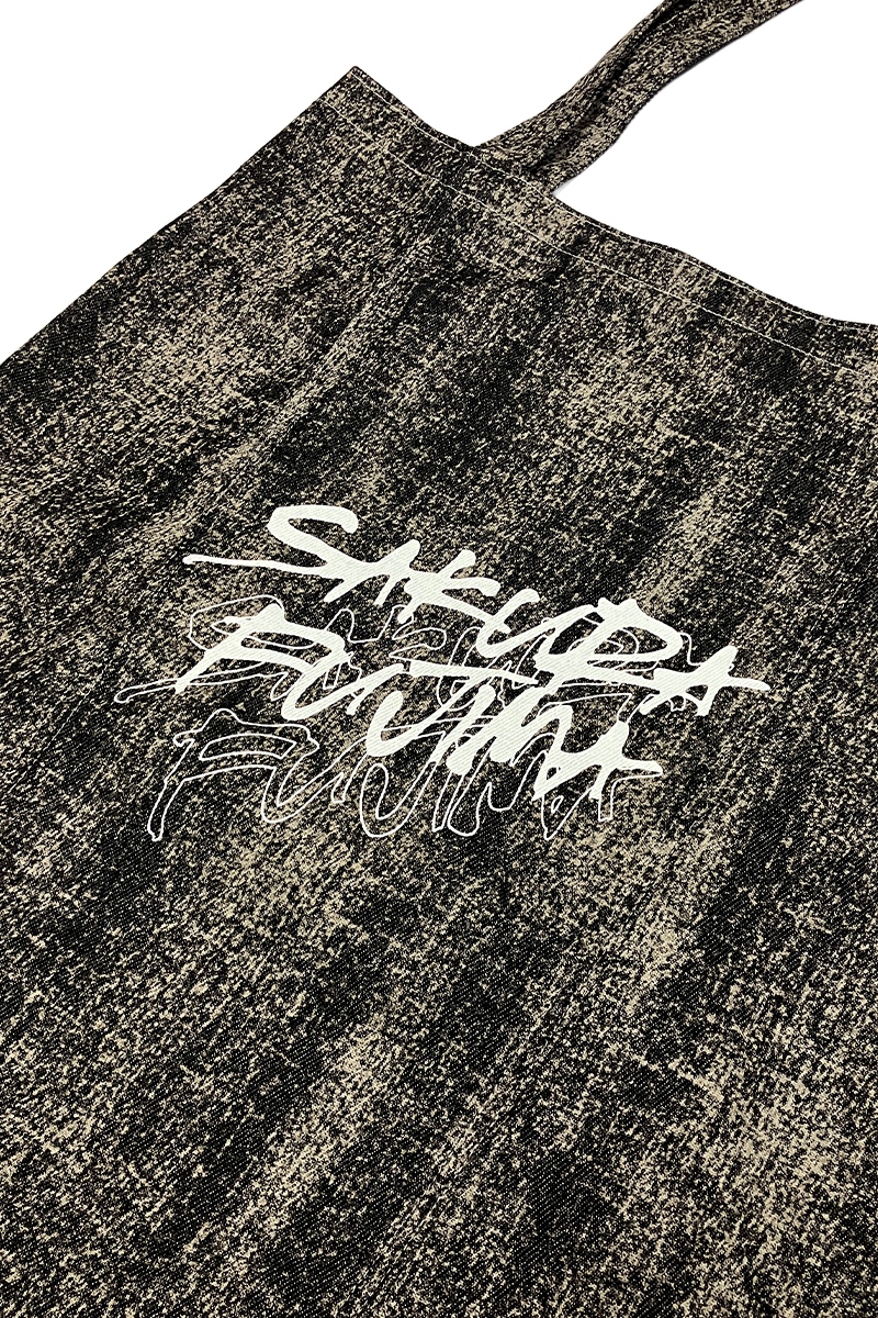ウォッシュ加工をしたデニム生地に本コラボオリジナ・ロゴをプリント。
