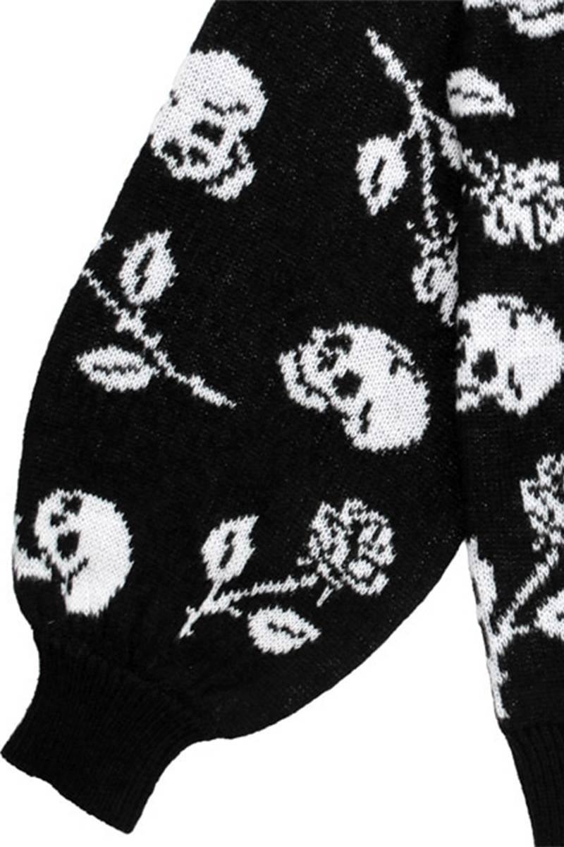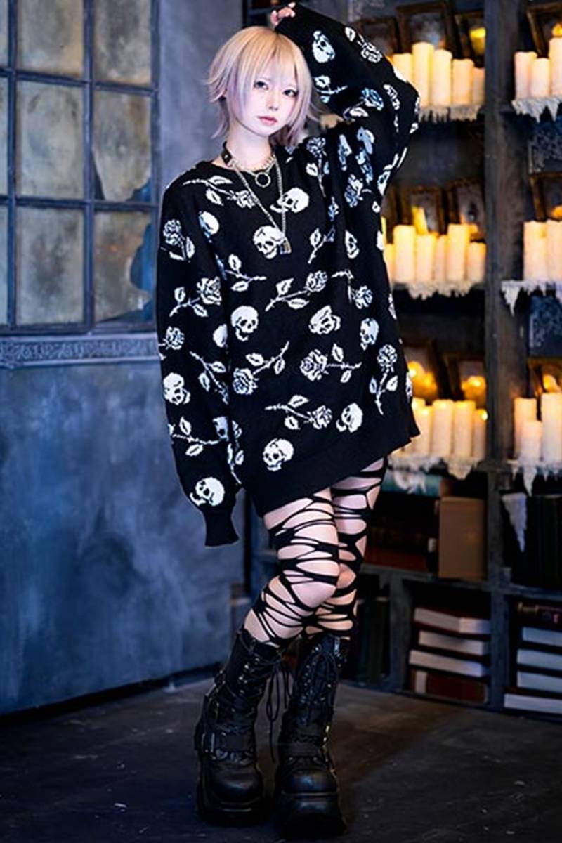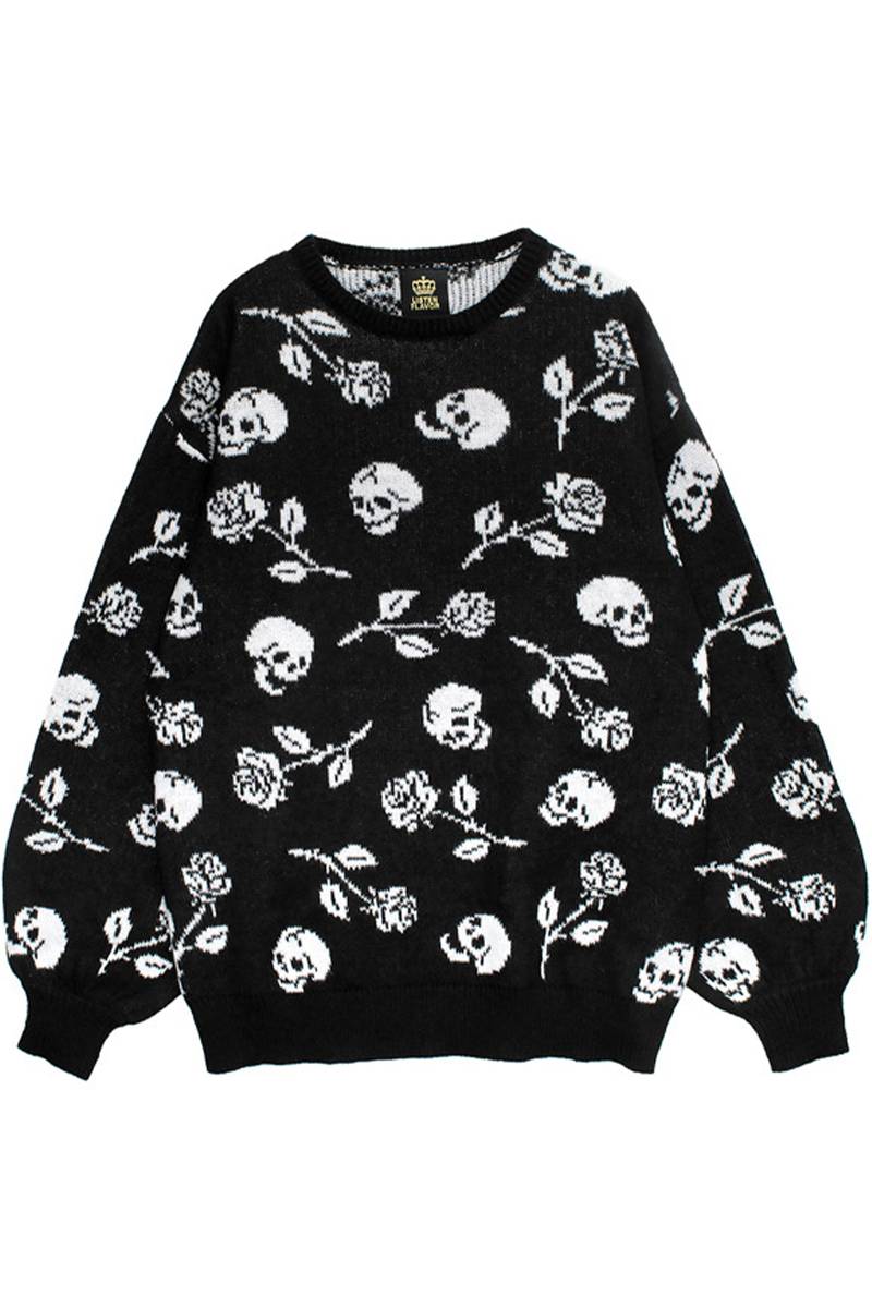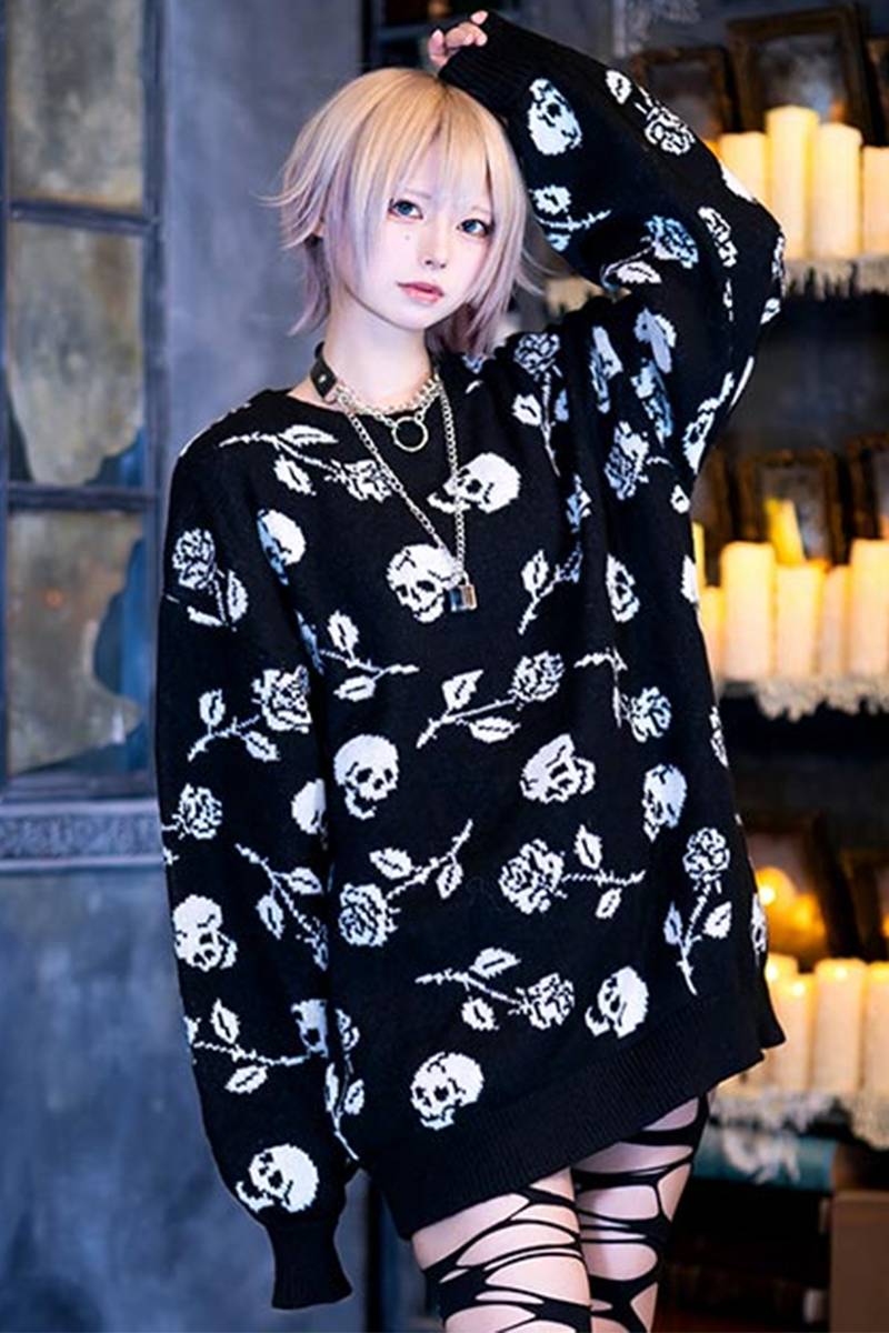 夜の闇に浮かぶダークな薔薇と髑髏がゴシックでミステリアスな総柄ニットセーター。