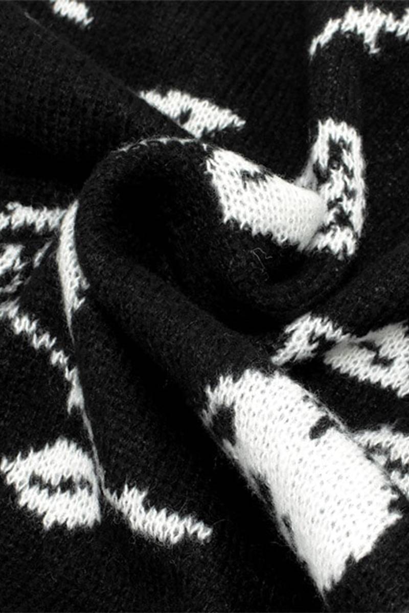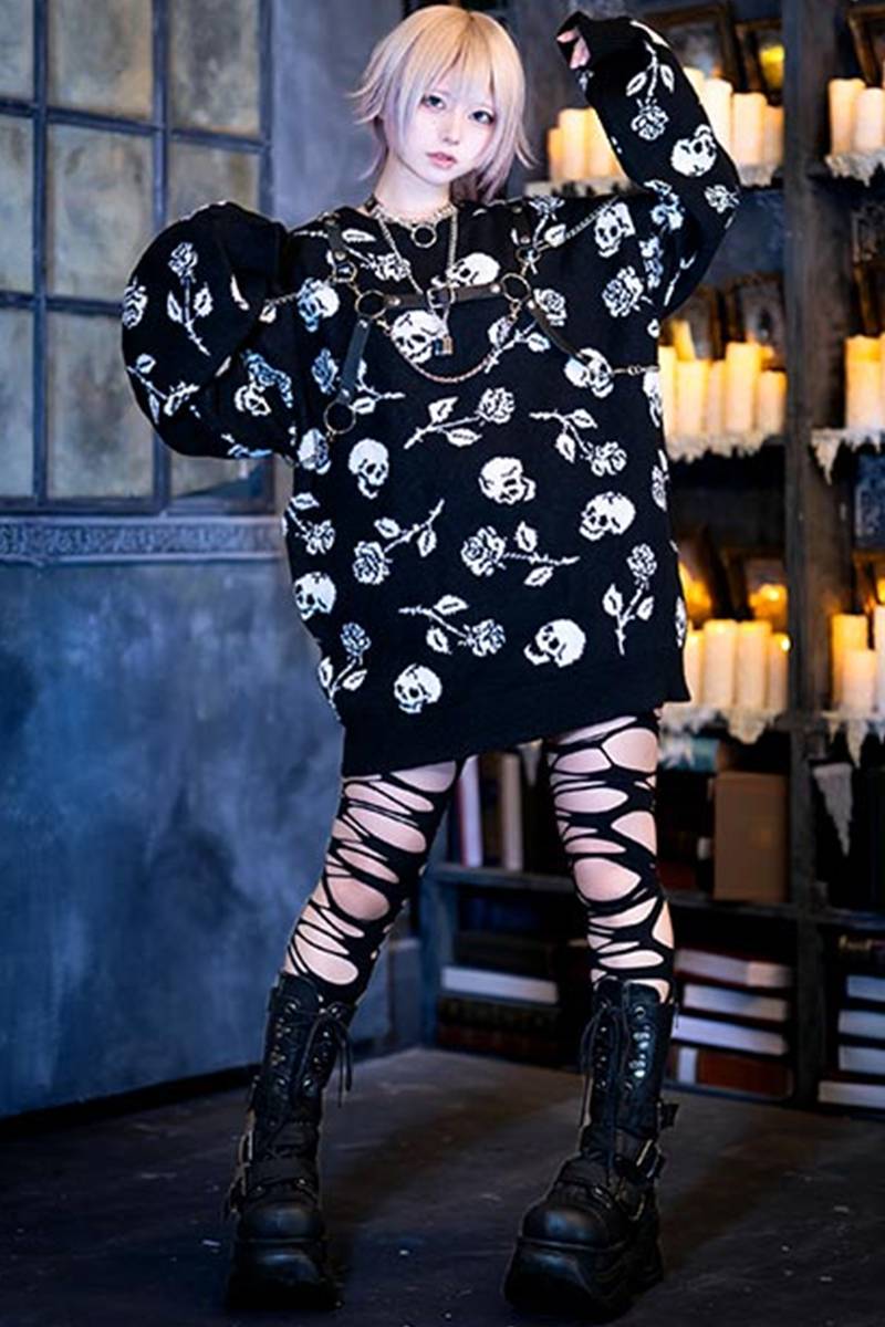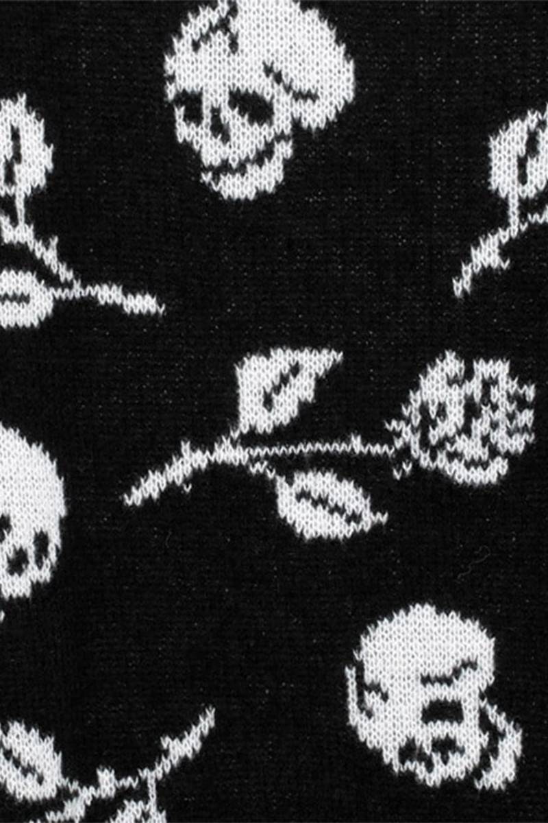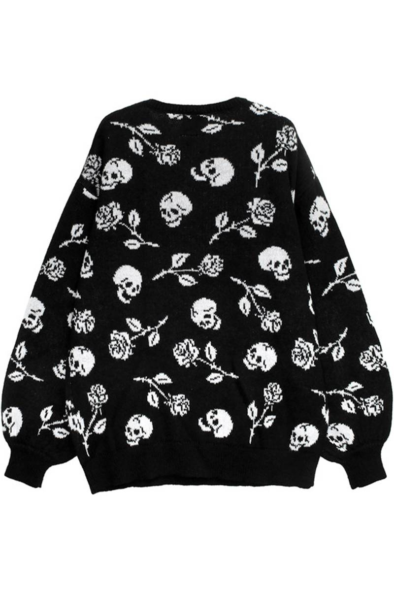 夜の闇に浮かぶダークな薔薇と髑髏がゴシックでミステリアスな総柄ニットセーター。