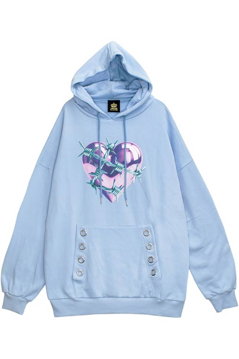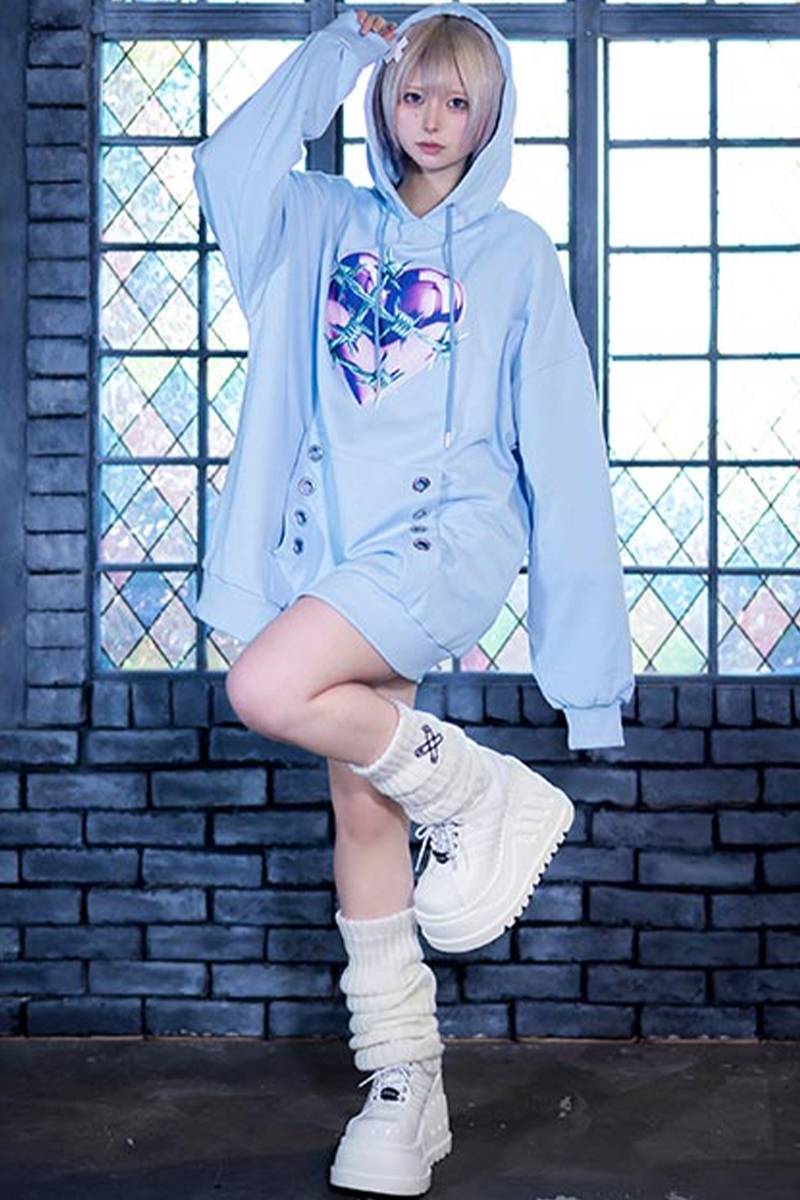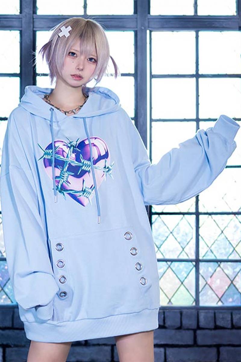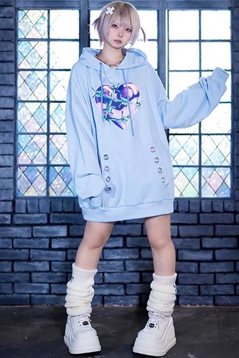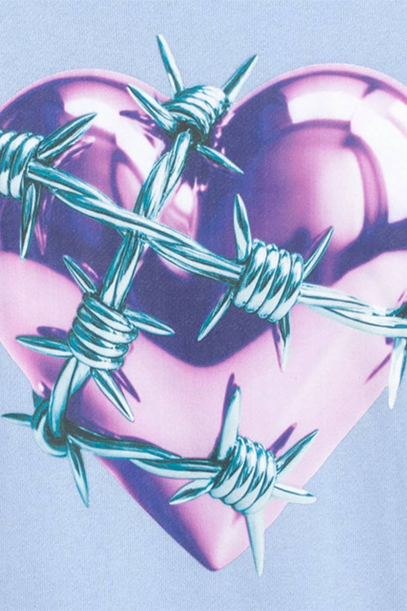 シャイニーなメタルハートに鋭く尖った有刺鉄線が絡みつくエッジィで重厚感のあるオーバーサイズパーカー。