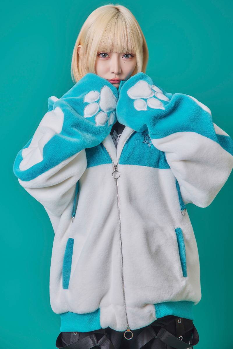 袖の肉球モチーフやフードのピン装飾など、細部まで遊び心たっぷり。
