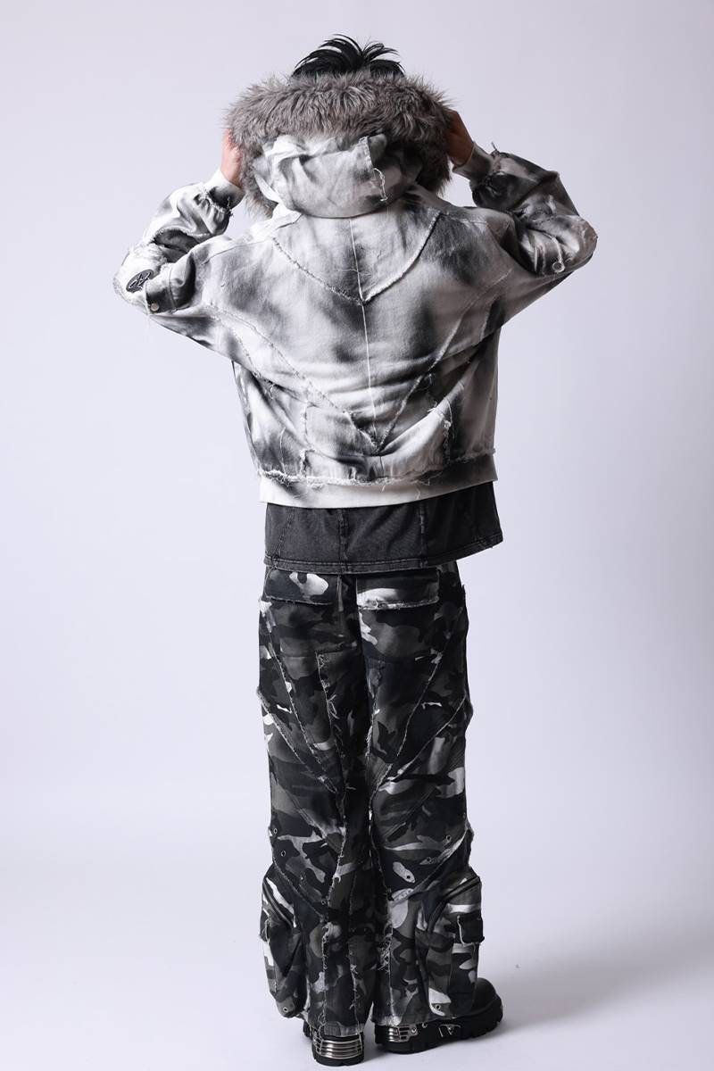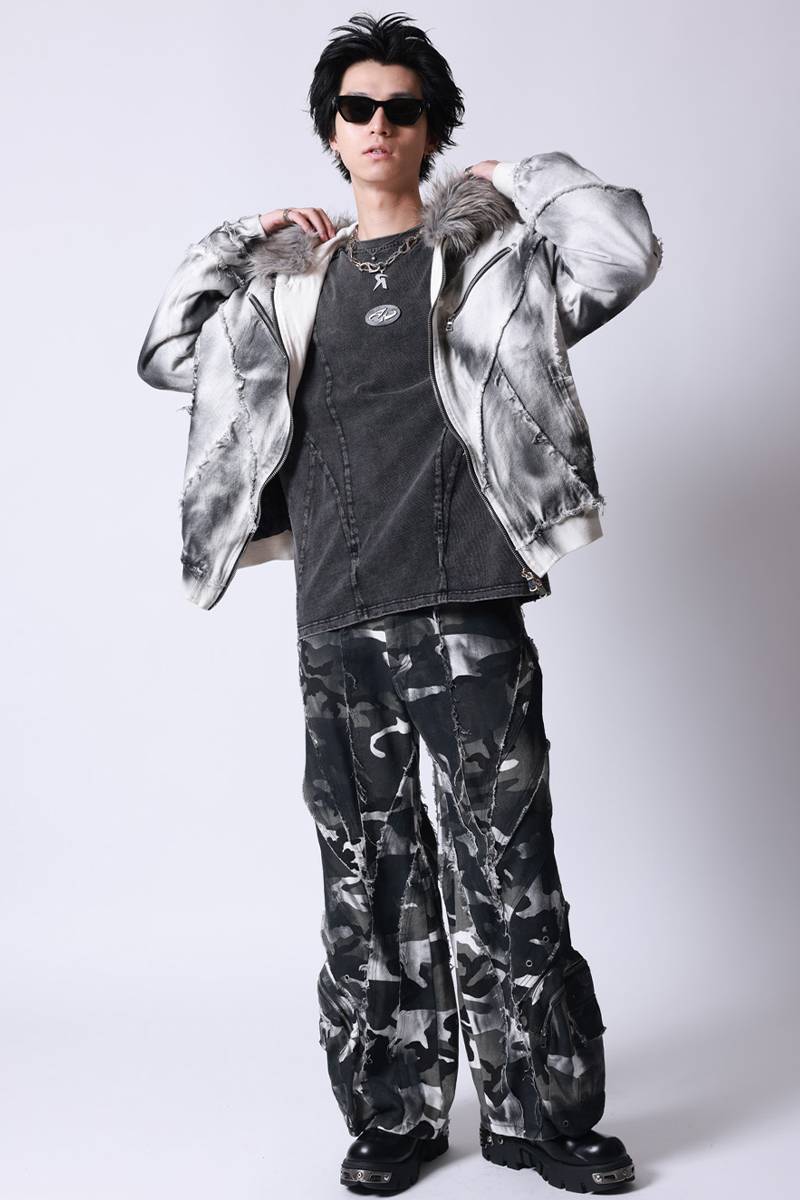 ブランドが得意とする切替デザインとスプレーでの染色によるグラデーションがグランジの風合いを醸し出します。