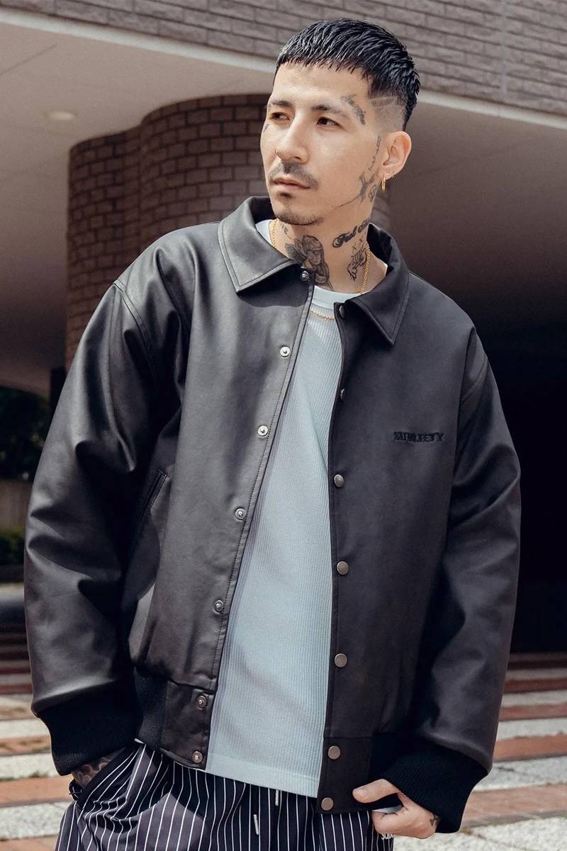 襟付きのバーシティージャケット。表地にはヴィンテージのような色ムラがあり、リアルレザーのようなシボ感をもつPUレザーを採用。