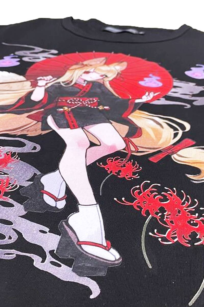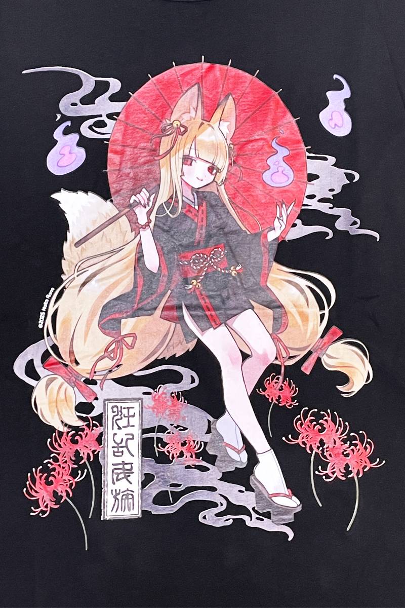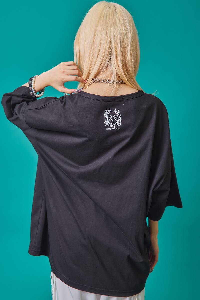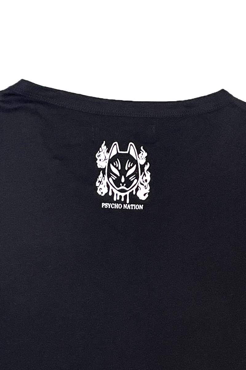 寝田ルネ×PSYCHO NATION(サイコ・ネーション) キツネ着物Tee - Black