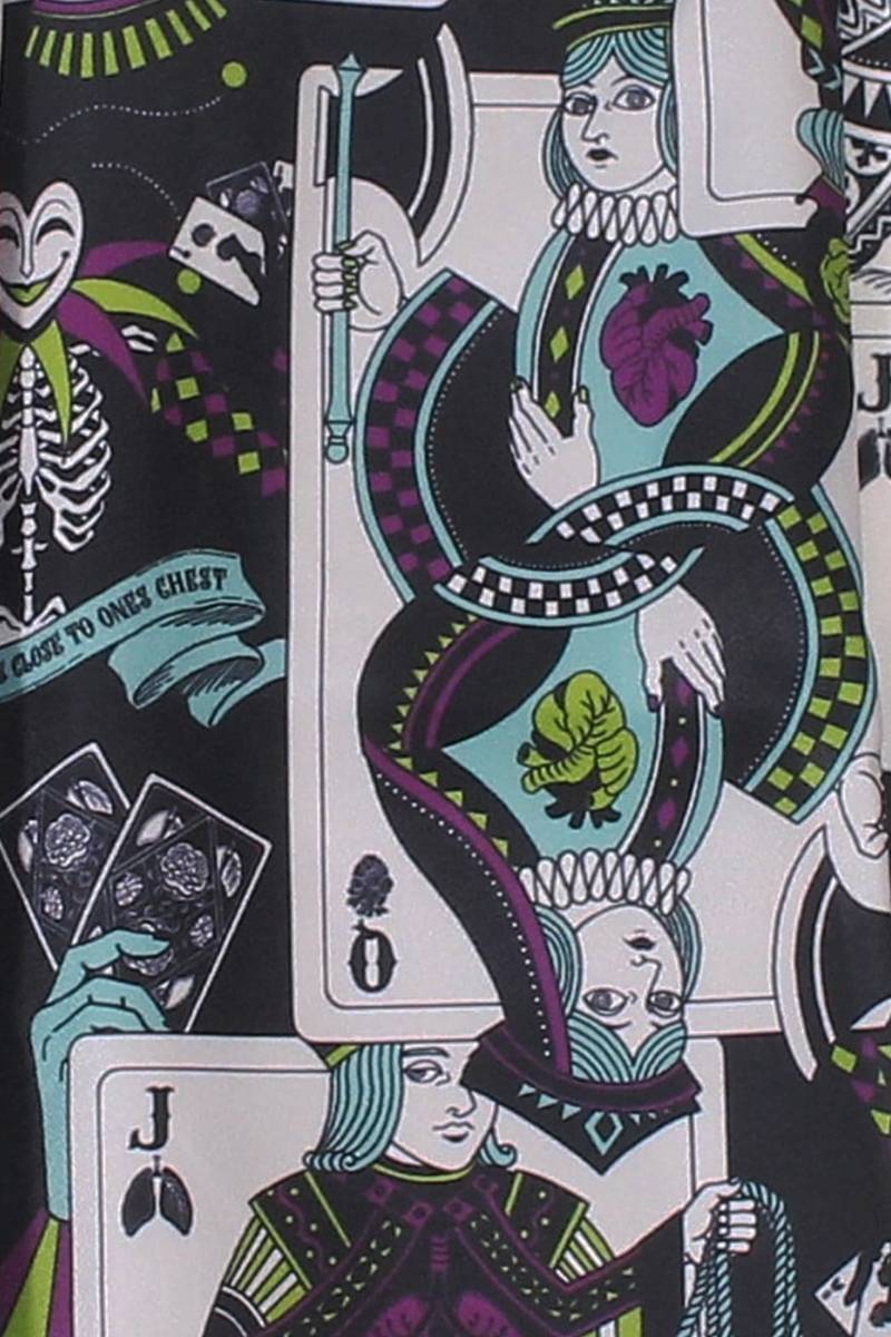 袖からサイドにかけて配されたこのトランプ柄は、王や女王たちがまるで“生きた解剖図”となったような、ブラックユーモアと不気味な美しさが共存するデザインです。
