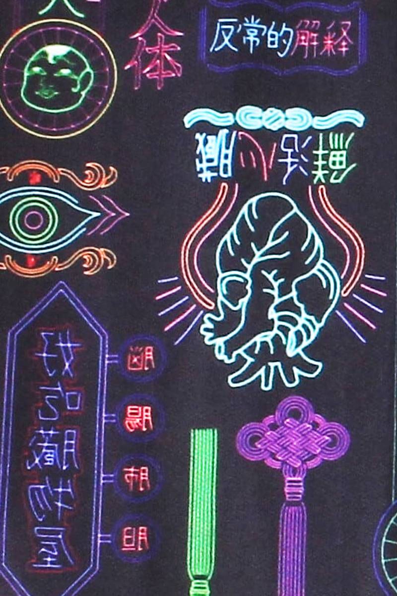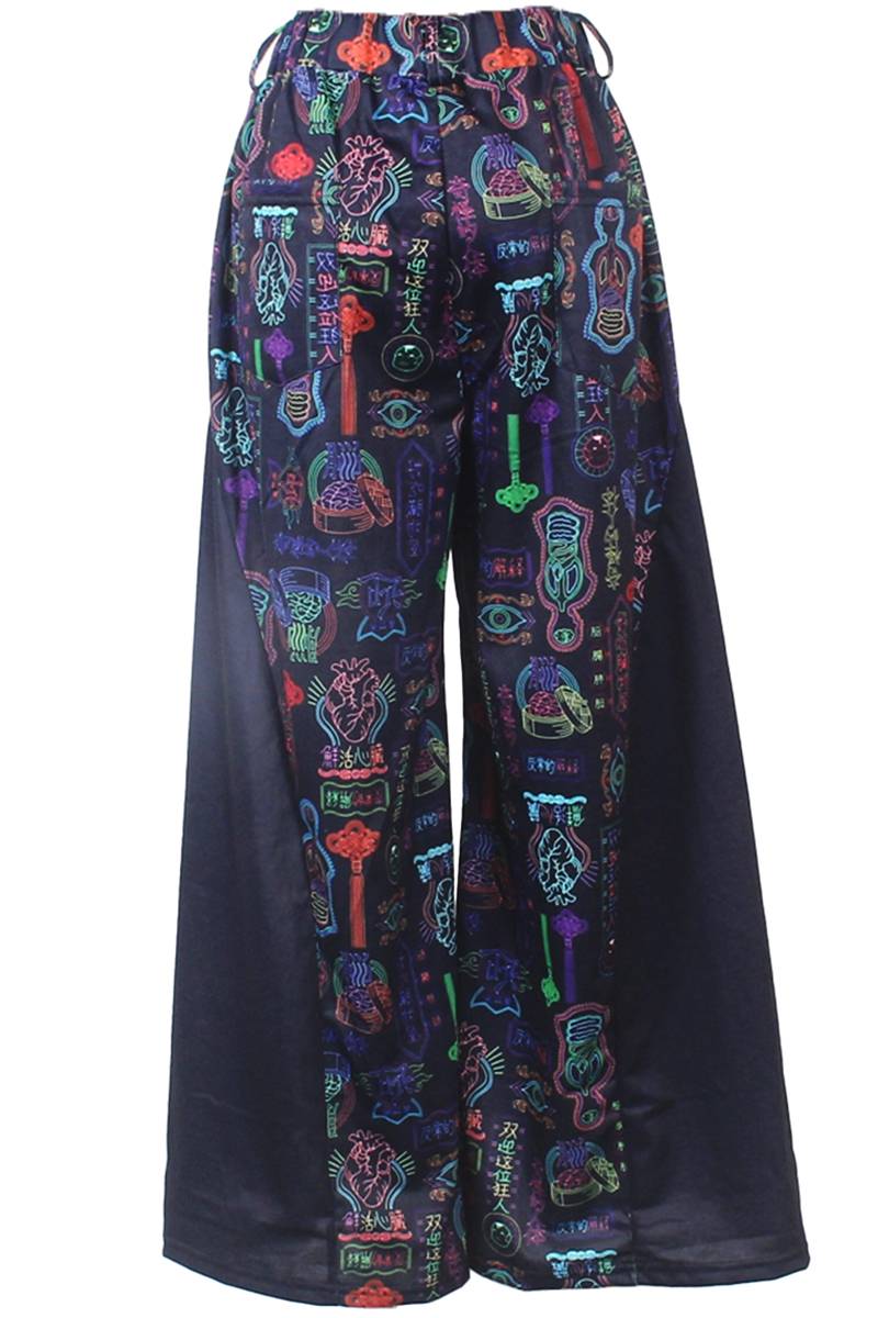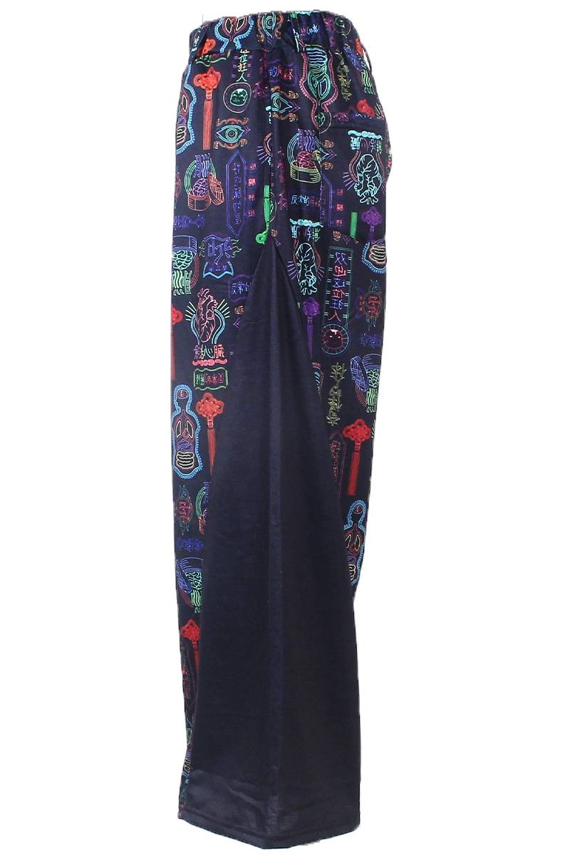 臓器販売店のネオン看板をモチーフにした総柄が目を惹くワイドパンツが登場。