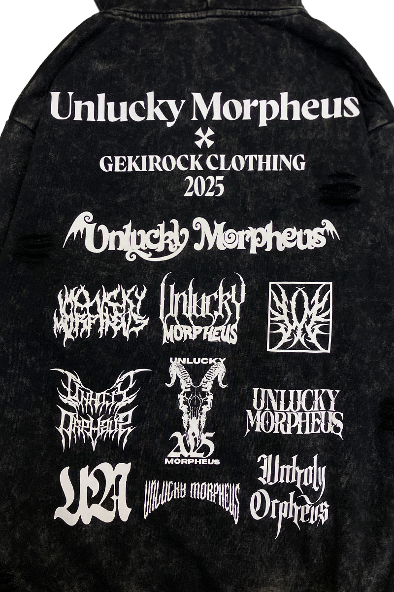 バックには今回コラボのオリジナル・ロゴや過去コラボ時のロゴ、さらには"Unholy Orpheus"のロゴも入ったUnlucky Morpheus ×GEKIROCK CLOTHINGコラボの集大成のようなデザイン。