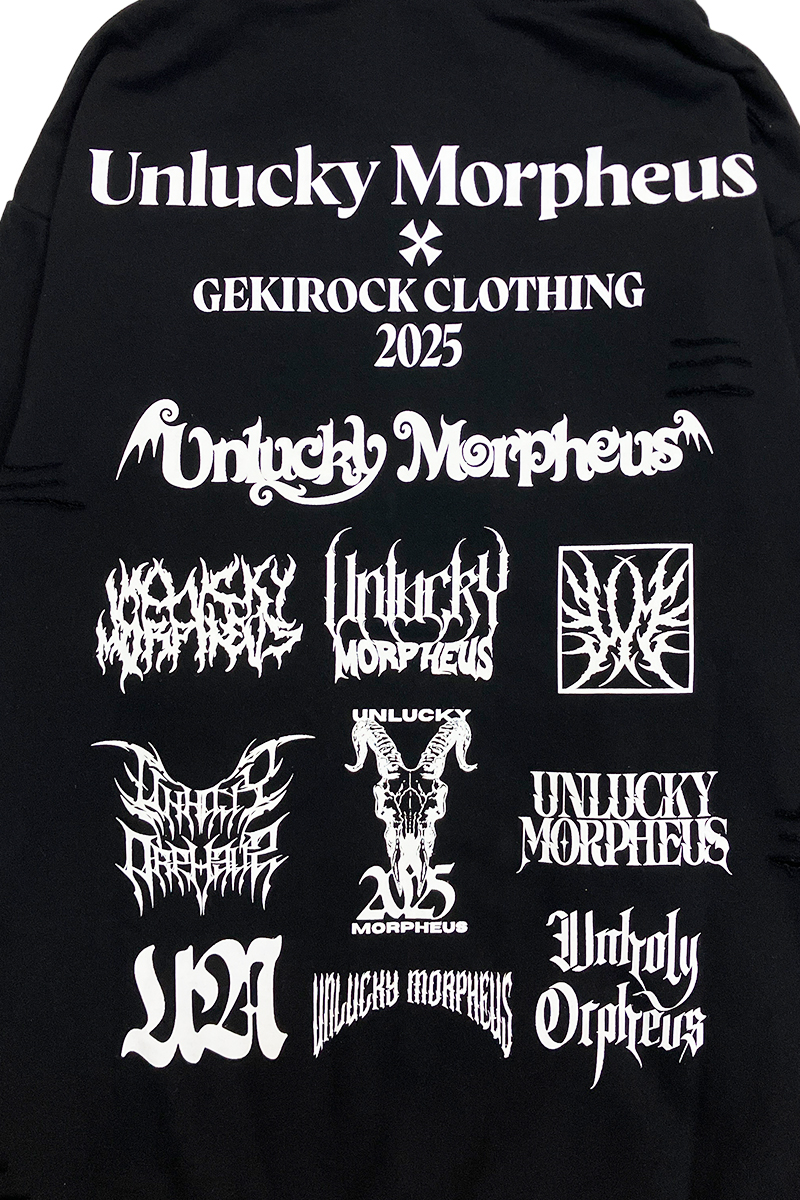 バックには今回コラボのオリジナル・ロゴや過去コラボ時のロゴ、さらには"Unholy Orpheus"のロゴも入ったUnlucky Morpheus ×GEKIROCK CLOTHINGコラボの集大成のようなデザイン。