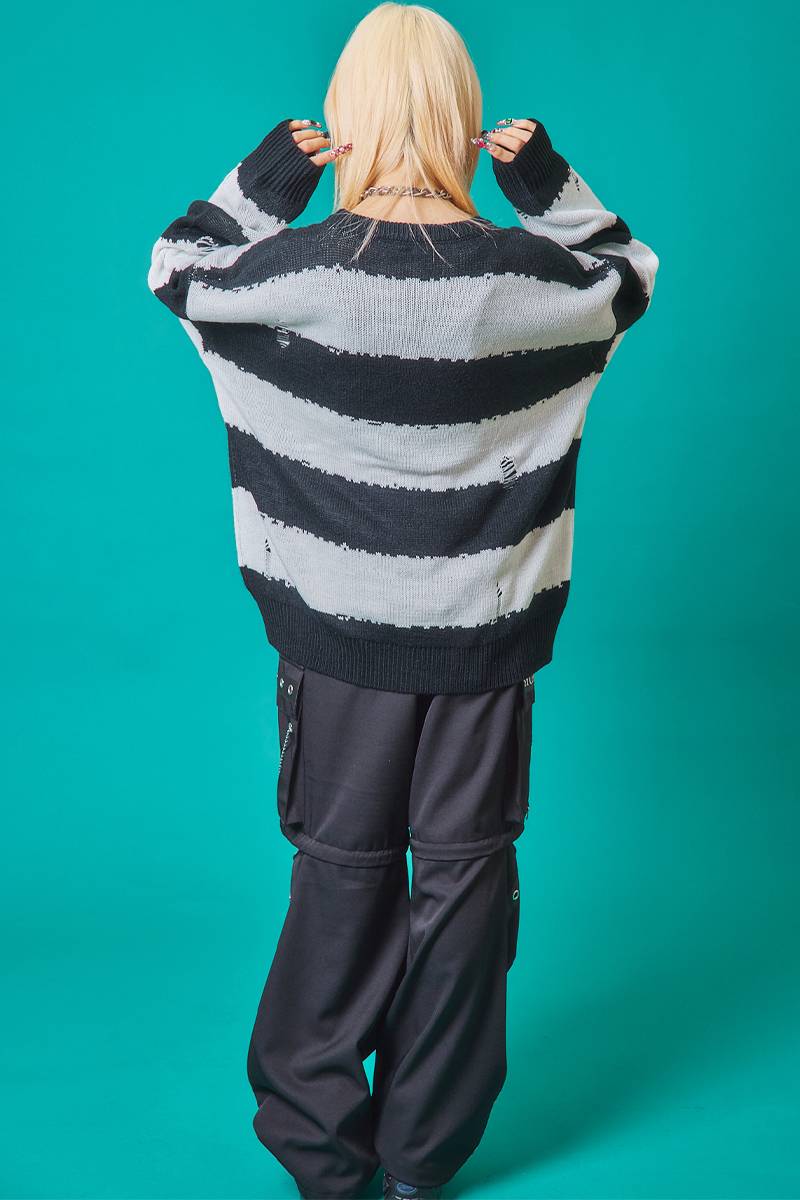 ボーダーがモードな存在感を放ち、1枚でコーディネートを仕上げる主役級アイテム。