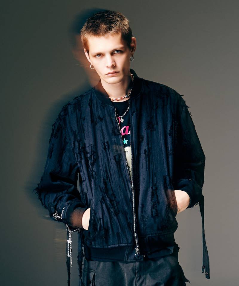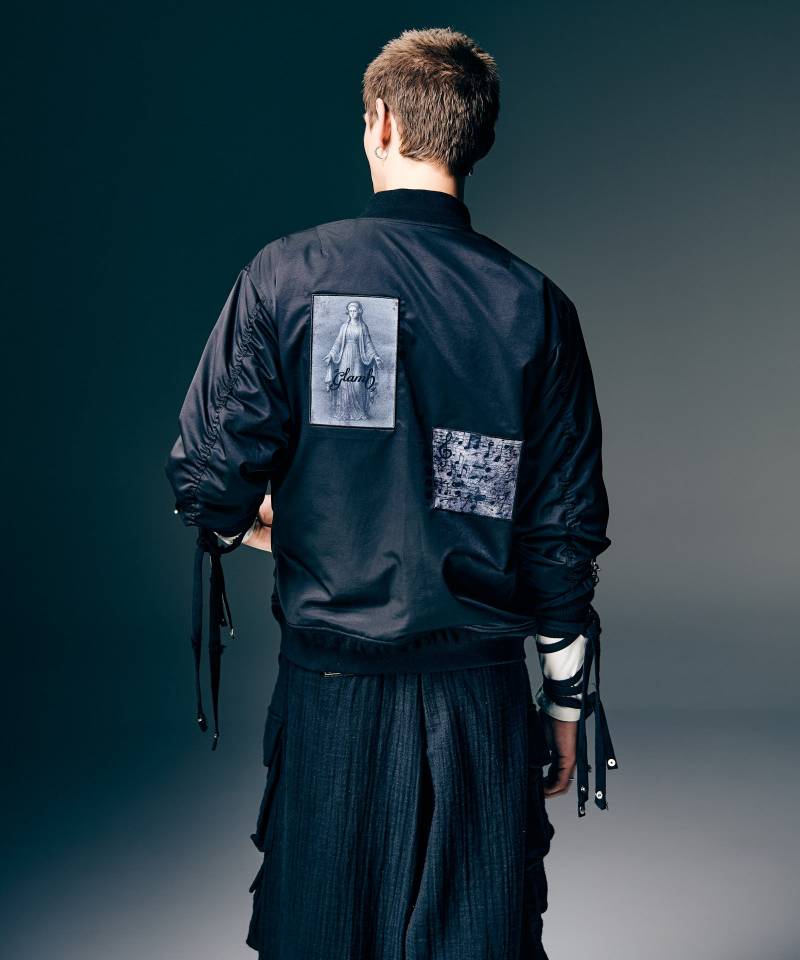 “Shadow of the Wind”をコレクションテーマに掲げた今季のglambのリリカルな世界観をミリタリーウェアに掛け合わせたBlow Reversible Bomber Jacket。ワイドシルエットのボディは宗教画や紋章の当て布を身頃の前後にパッチ。柄の中には音楽にまつわるモチーフをさりげなく隠し込んだglambらしいグラフィックワークが発揮されています。そこにあしらわれた今季のシーズンディテールが左右の袖口のDカンに繋がれるロングテープ。袖口に巻き付けたボンデージ的なアレンジもブランドからの提案です。逆面にはカラーバリエーションごとに異なるテキスタイルを使用。総柄使いのLeopardとCamoに加え、立体的なフリンジがランダムに覗くBlackもラインナップします。ボディはリバーシブルとなっており、袖口のDカンも両面に用意。ボディの2WAYとロングテープのアレンジを掛け合わせ、幅広いスタイリングを形作ることのできる1着となっております。今季のアクセサリーラインで用意されるストラップシリーズ(*)のさらなる重ね付けもブランドからの提案です。