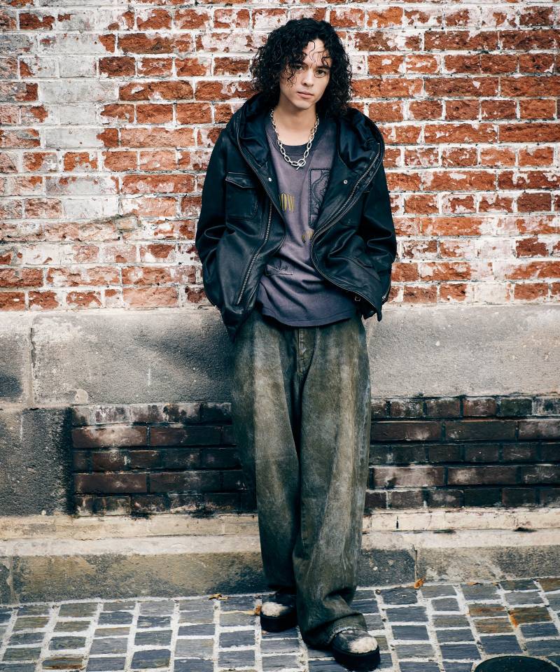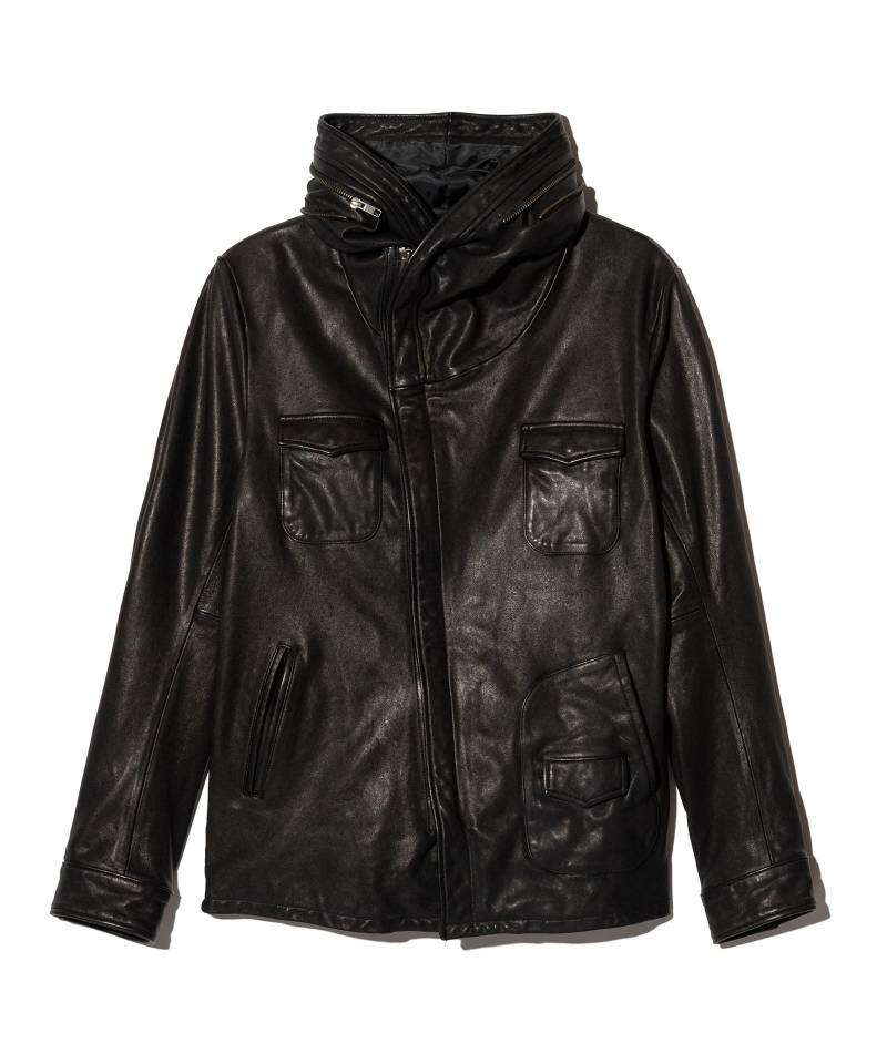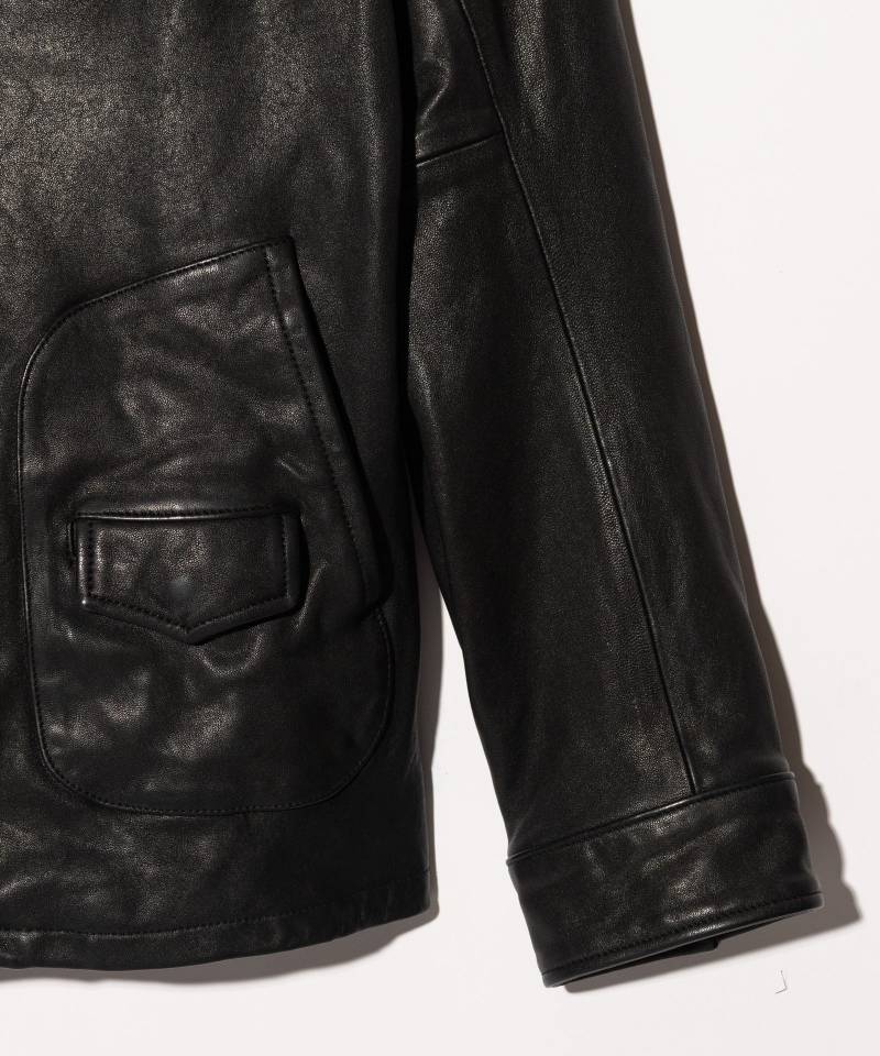 レザーとドレープという相反する要素を緻密なパターンワークで融合したglambのデザインライダース、Carol Rosso Riders Jacket。アイコニックな造形を見せるのが首回りを立体的に取り囲むハイネック。立体襟の外側に配されたジップを開けると大ぶりのフードが現れるというギミックも隠し込んだ、機能性も兼ね揃えるデザインとなっています。その創造的な佇まいに対して、前身頃のポケットレイアウトはラギッドで実用的な仕様に反映。フラップ付きの胸ポケットとアシンメトリーなウエストポケットの4ポケットがタフなムードを覗かせます。さらにそのムードを支えるのがベジタブルタンニン鞣しのラムレザー。素材本来の風合いを残して仕上げた革を縫製後に洗いにかけ、仕上げに職人の手作業によるプレスとワックス加工で成形することで幾年も大切に着こまれたかの皺感や艶を演出しています。フィッティングはバイカーライクなゆとりある着丈のレギュラーシルエット。2色展開のカラーバリエーションではスタンダードなBlackに加え、スムースレザーとスエードをコンビ使いで配色にしたMultiもラインナップします。