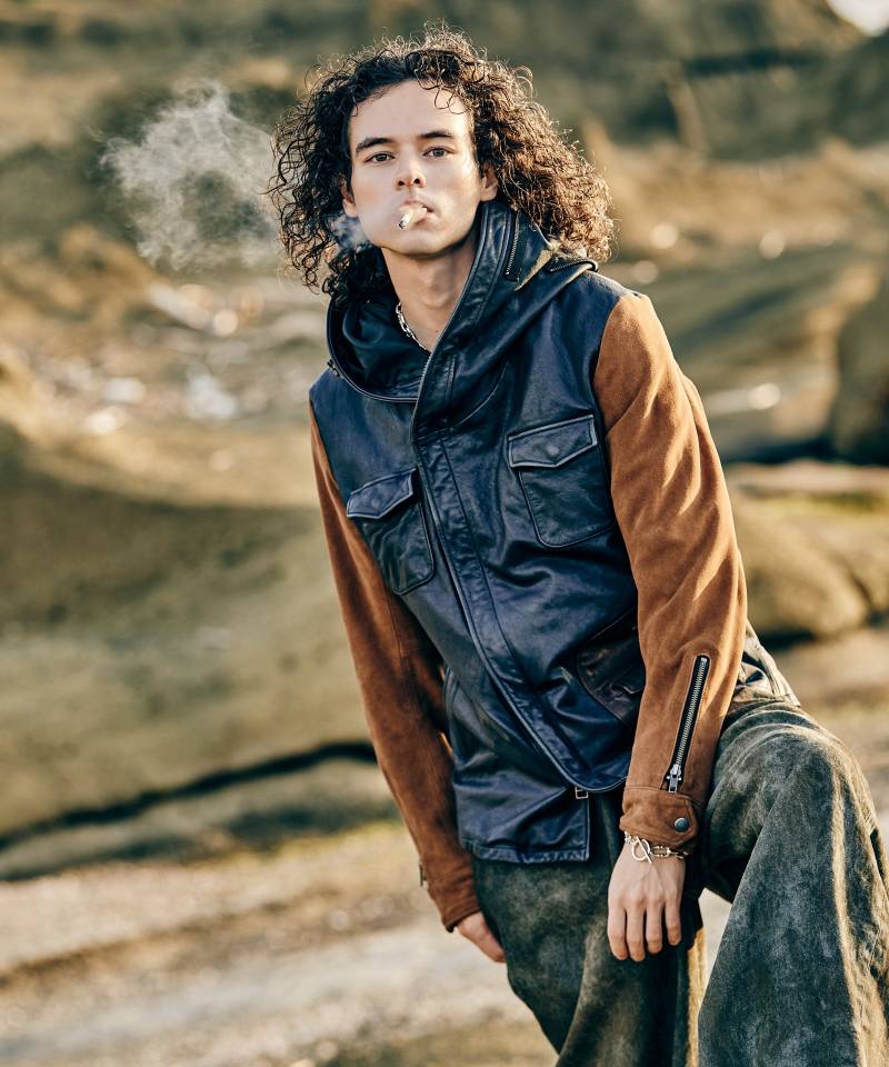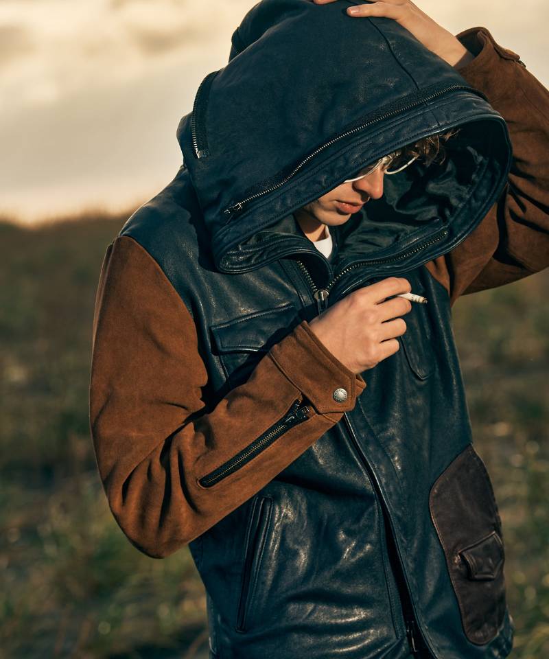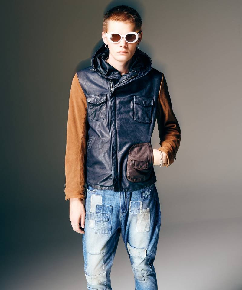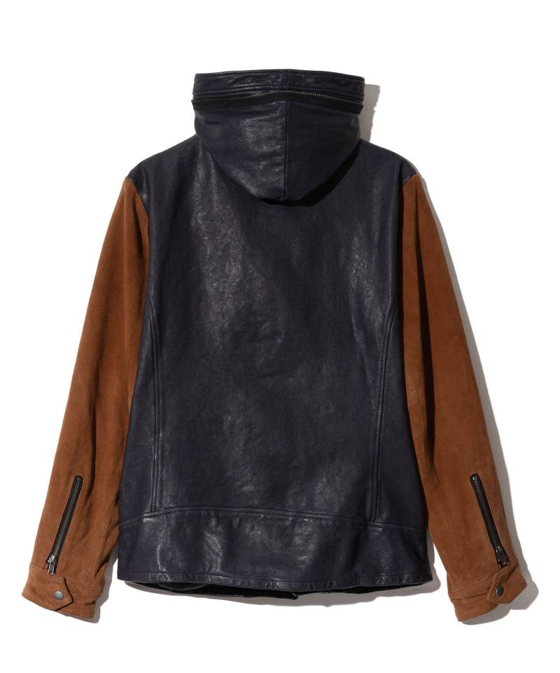 レザーとドレープという相反する要素を緻密なパターンワークで融合したglambのデザインライダース、Carol Rosso Riders Jacket。アイコニックな造形を見せるのが首回りを立体的に取り囲むハイネック。立体襟の外側に配されたジップを開けると大ぶりのフードが現れるというギミックも隠し込んだ、機能性も兼ね揃えるデザインとなっています。その創造的な佇まいに対して、前身頃のポケットレイアウトはラギッドで実用的な仕様に反映。フラップ付きの胸ポケットとアシンメトリーなウエストポケットの4ポケットがタフなムードを覗かせます。さらにそのムードを支えるのがベジタブルタンニン鞣しのラムレザー。素材本来の風合いを残して仕上げた革を縫製後に洗いにかけ、仕上げに職人の手作業によるプレスとワックス加工で成形することで幾年も大切に着こまれたかの皺感や艶を演出しています。フィッティングはバイカーライクなゆとりある着丈のレギュラーシルエット。2色展開のカラーバリエーションではスタンダードなBlackに加え、スムースレザーとスエードをコンビ使いで配色にしたMultiもラインナップします。