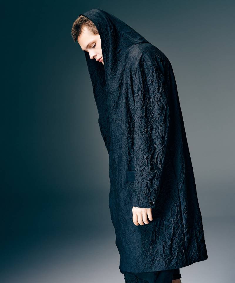 今季glambがテーマとして掲げる“Shadow of the Wind”の世界観を陰影あるテキスタイルに閉じ込めたスプリングコート、Crinkle Shawl Collar Coat。身生地に用いたのは生地段階でキャッチワッシャー加工によって皺の表情を刻んだ薄手のツイル生地。身幅に程よくゆとりを持たせた膝丈のボディは、首元をショールカラーでまとめて優雅なムードに。ポケットはカジュアルな印象のアウトポケット、仕立ては芯や裏地を省いたアンコンとすることで、季節感を捉えたイージーな1着としてまとめています。