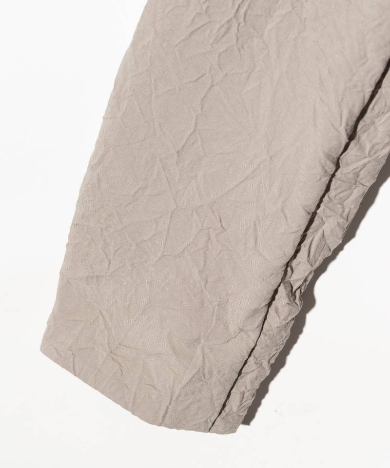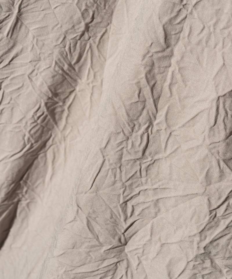 今季glambがテーマとして掲げる“Shadow of the Wind”の世界観を陰影あるテキスタイルに閉じ込めたスプリングコート、Crinkle Shawl Collar Coat。身生地に用いたのは生地段階でキャッチワッシャー加工によって皺の表情を刻んだ薄手のツイル生地。身幅に程よくゆとりを持たせた膝丈のボディは、首元をショールカラーでまとめて優雅なムードに。ポケットはカジュアルな印象のアウトポケット、仕立ては芯や裏地を省いたアンコンとすることで、季節感を捉えたイージーな1着としてまとめています。