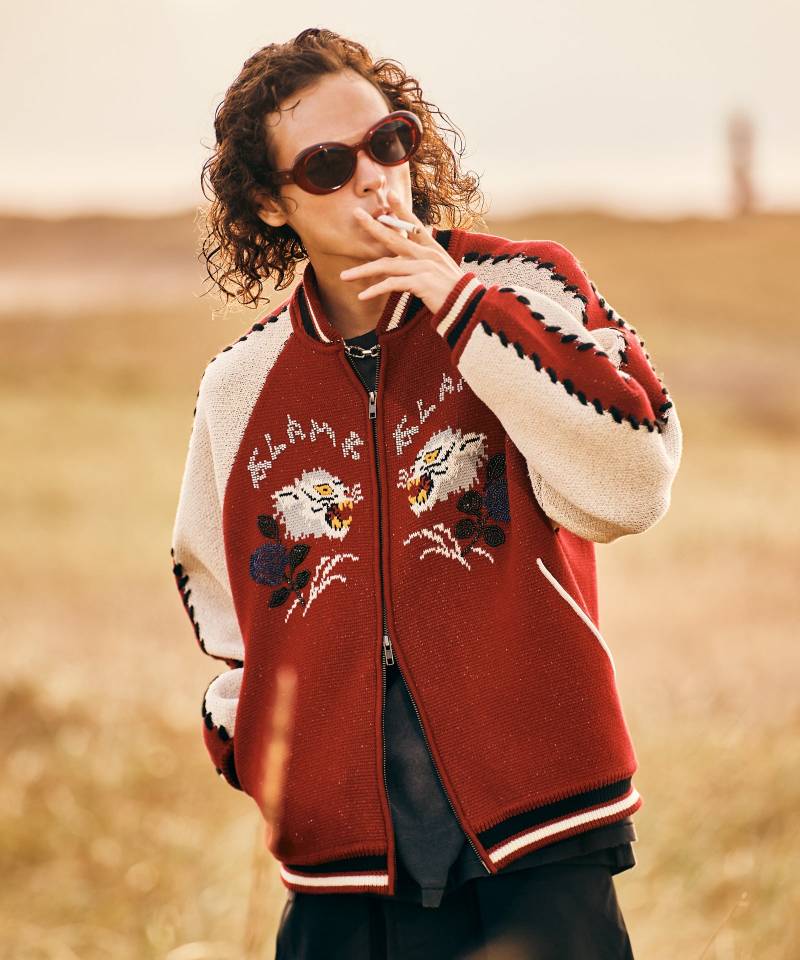スカジャンパーをニットで再構築し、幻想が入り混じったかのルックスで人気を博したKnit Ska Jumperが新たな柄使いで今春も登場。ラグランスリーブのボディにジャガードであしらわれたのは中国の四神に数えられる白虎。それを取り囲むブランドロゴや植物柄のビーズ使い、そしてパイピングを模したアームのステッチは職人のハンドメイドとなっており、随所にクラフトマンシップ溢れる仕上がりとなっています。シルエットは身幅と着丈の双方をコンパクトにまとめたジャストフィッティング。アウターとしてはもちろん、カーディガン感覚でインナー使いも楽しめる1着です。