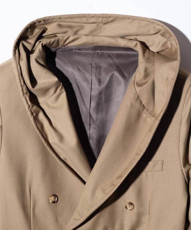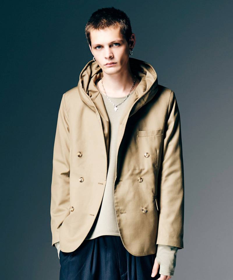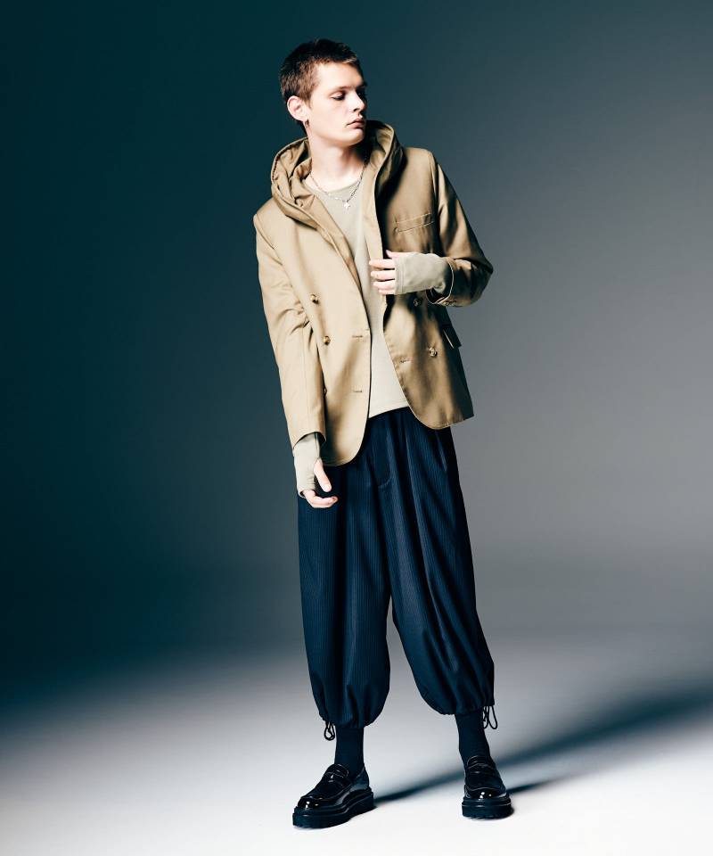 ダブルブレストジャケットに構築的なドレープワークを掛け合わせ、ドレスとストリートを融合したCarol Tailored Jacket。胸元から首回りを立体的に取り囲む襟のデザインはglambの定番ディテールである