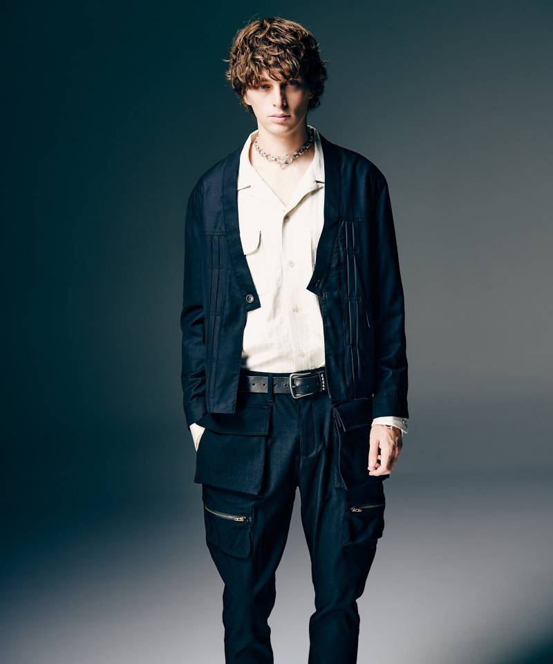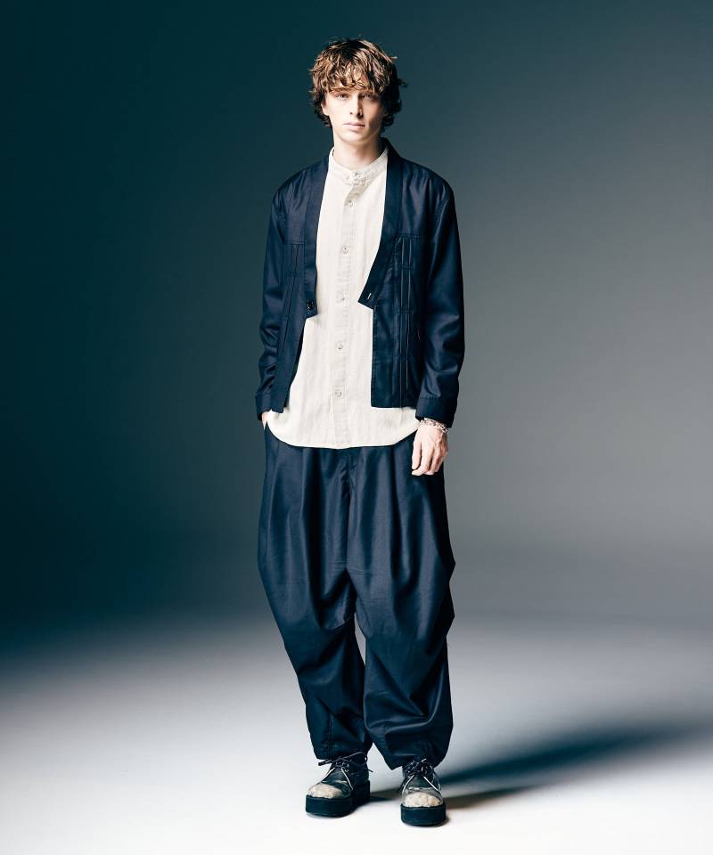 デニムジャケットに和装のエッセンスを大胆に融合した意欲的な1着がKimono Based Jacket。一つボタン仕様のボディは着物を思わせるノーカラーの前合わせ。ボックスステッチで抑えたフロントのプリーツもどこか和風の佇まいを醸します。シルエットは着丈をコンパクトにまとめたショートレングス。カラーバリエーションではワーク調のIndigoに対し、より和装のムードを感じさせるBlackと色遣いによって異なるムードにもご注目ください。
