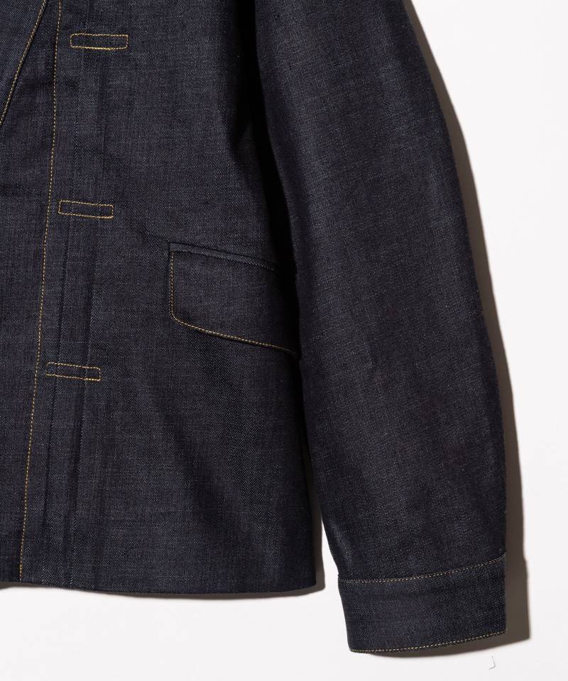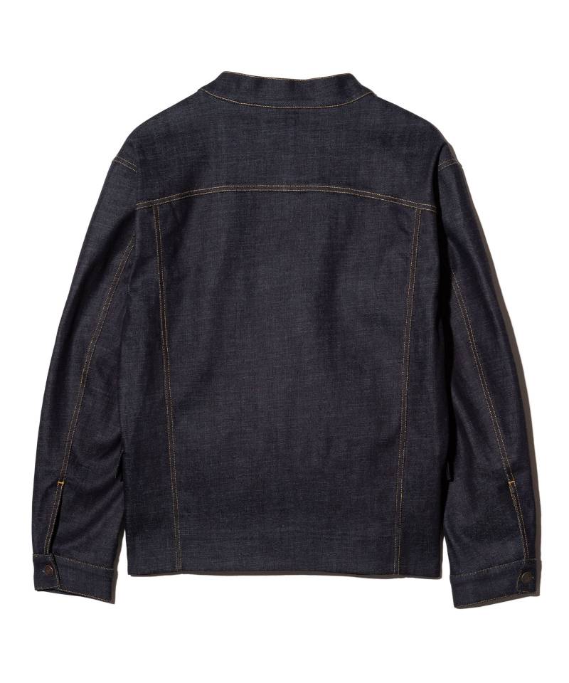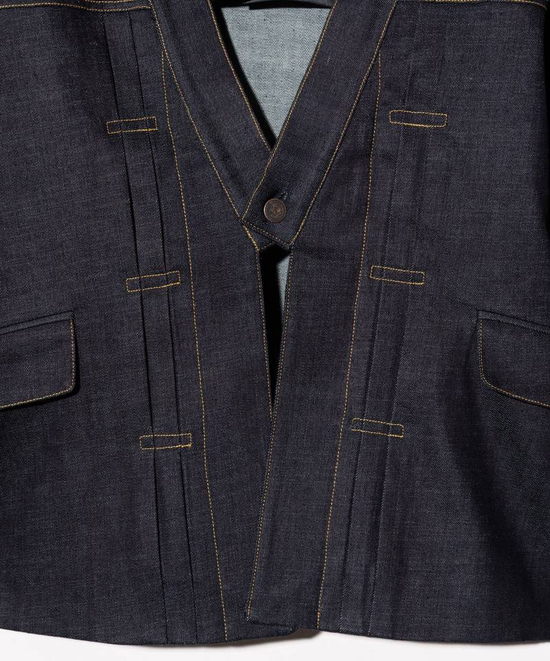 デニムジャケットに和装のエッセンスを大胆に融合した意欲的な1着がKimono Based Jacket。一つボタン仕様のボディは着物を思わせるノーカラーの前合わせ。ボックスステッチで抑えたフロントのプリーツもどこか和風の佇まいを醸します。シルエットは着丈をコンパクトにまとめたショートレングス。カラーバリエーションではワーク調のIndigoに対し、より和装のムードを感じさせるBlackと色遣いによって異なるムードにもご注目ください。