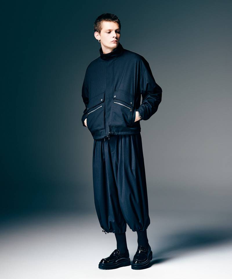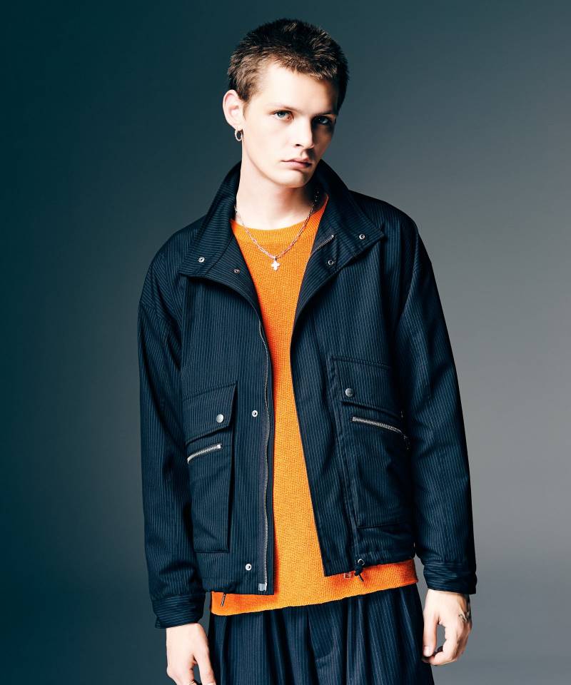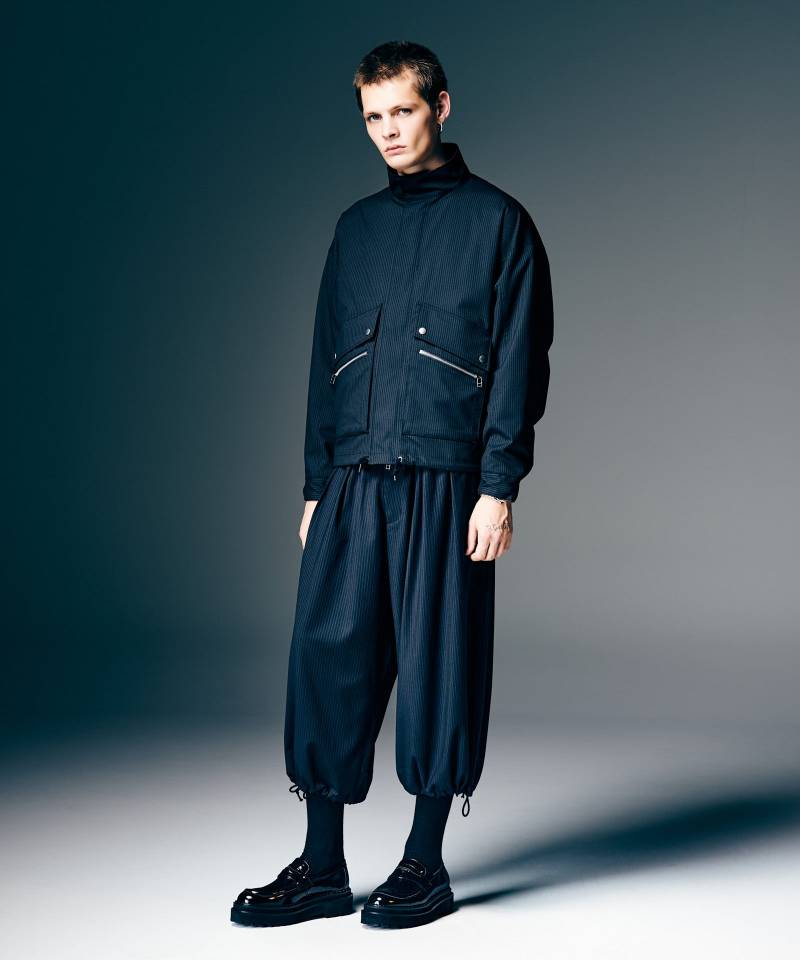 ミニマルなボディの中にエッジィなディテール使いを効かせ、glambならではのベーシックスタイルを提案するDouble Pocket Blouson。テキスタイルに用いたのはレーヨン混の落ち感ある質感とクラシカルなストライプ柄が特徴のストレッチ生地。着回しを選ばないレギュラーシルエットのボディに、