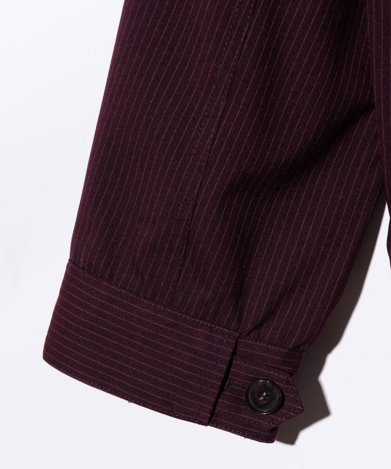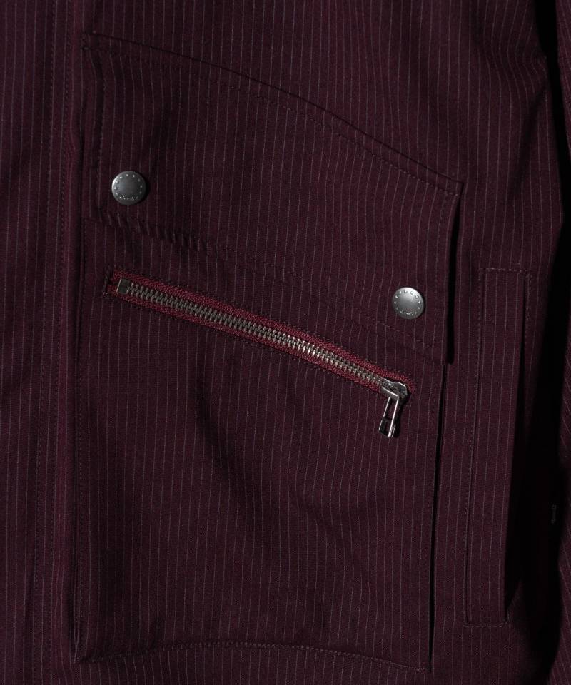 ミニマルなボディの中にエッジィなディテール使いを効かせ、glambならではのベーシックスタイルを提案するDouble Pocket Blouson。テキスタイルに用いたのはレーヨン混の落ち感ある質感とクラシカルなストライプ柄が特徴のストレッチ生地。着回しを選ばないレギュラーシルエットのボディに、