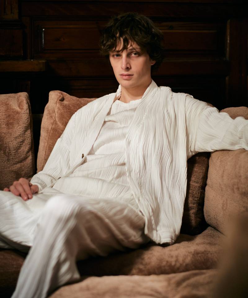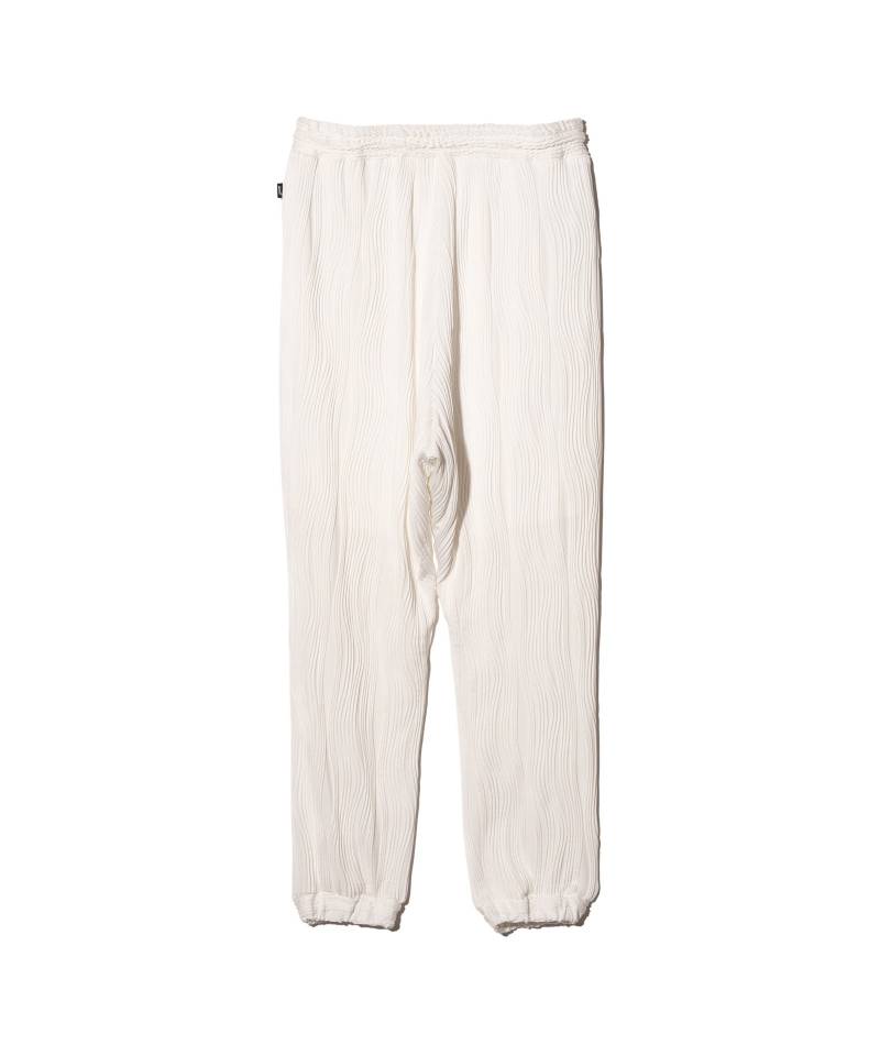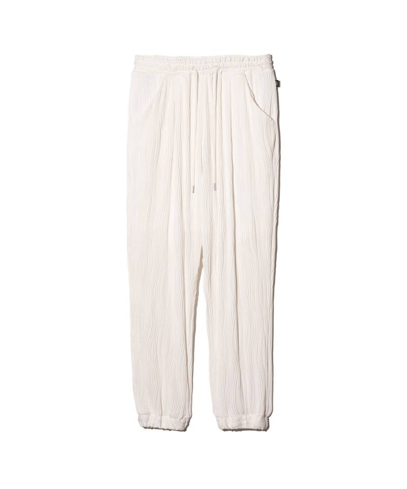 glambの人気カットソー“Willow Crepe”をカーディガンスタイルで提案するWillow Crepe Cardiganがセットアップで登場。楊柳生地を思わせるプリーツ状の流線型のタックは編み針で網目を作り、さらに編みを介して編地に結びつけるという手間を惜しまない工程で構築したもの。それをシャツやTシャツに羽織ってもだぶつかないコンパクトなカーディガンに仕立てました。ボトムスは腰元に1タックを取ったテーパードサルエルシルエット。裾部分はリブではなく身生地の横使いで表現、伸縮性と遊び心を兼ね揃えた仕立てであしらっています。