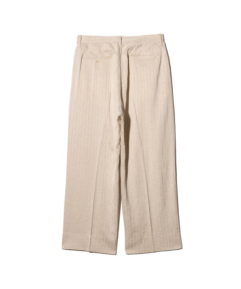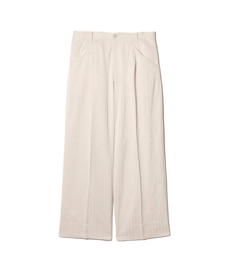リネン素材に意趣を凝らした織りを掛け合わせ、軽さと重厚さという相反する要素を同居させたStripe Jacquard Linen Shirt Set Up。テキスタイルは3本取りのストライプとヘリンボーンを組み合わせて凹凸と陰影を持たせたジャガード生地。素材に40番手の細糸を用いることで奥行き深い柄の表現を実現しています。トップスは胸ポケットを左右に配したワークライクなディテール使いによってラギッドで男性的なニュアンスを演出。ボトムスは前身頃のポケット口から1タックを設けた立体感あるワイドシルエット。セットアップでスタイリングいただくことでエレガントなリゾートルックが完成します。