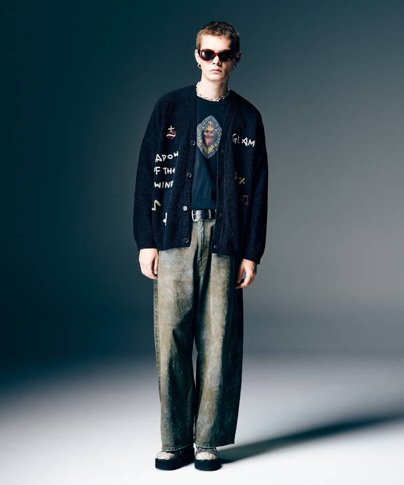 音楽をインスピレーションの根底に抱くglambが、アナログの温もりをデザインに落とし込んだHand Beaded Cardiganをリリース。凹凸ある表情のボディは鹿の子編み仕立て。ふんわりとした毛足のモール糸とシャープな高撚綿糸を合わせることで、深みのあるテクスチャを生み出しています。そこに散りばめたのが職人が施したビーズ刺繍。きらびやかな落書き調のタッチでラグジュアリーとリラックスが同居した佇まいを生み出しました。シルエットはレギュラー丈の着丈にゆとりある身幅を組み合わせたルーズサイズ。BlackとMintは単色、Purpleは杢調とカラーバリエーションに異なる表情となっています。