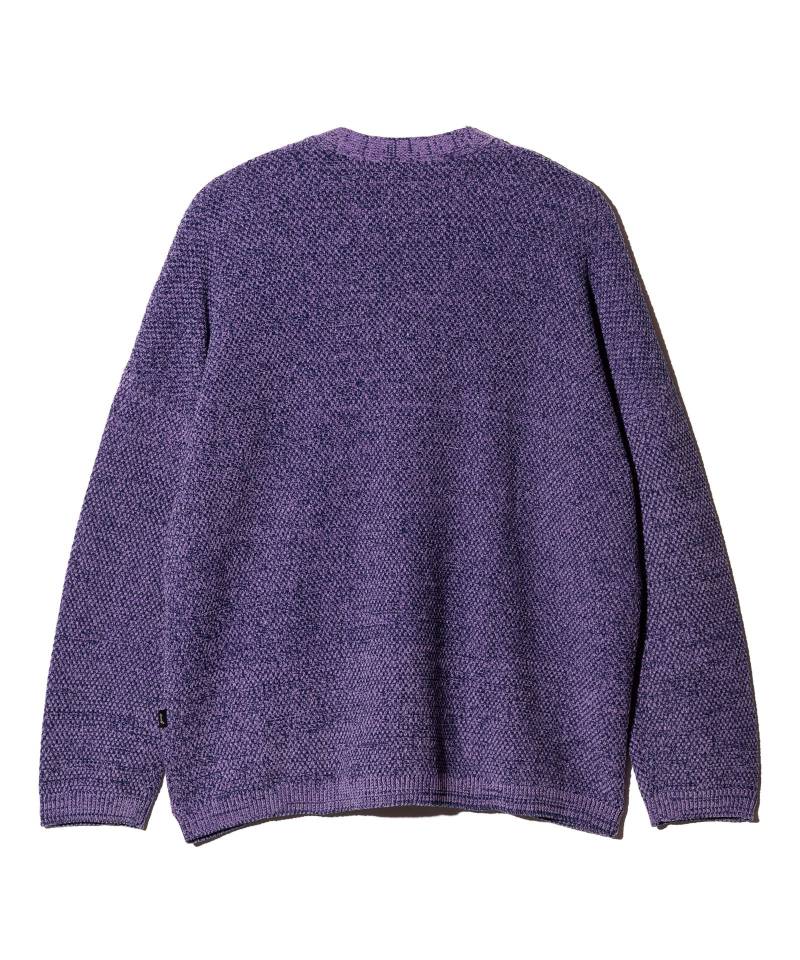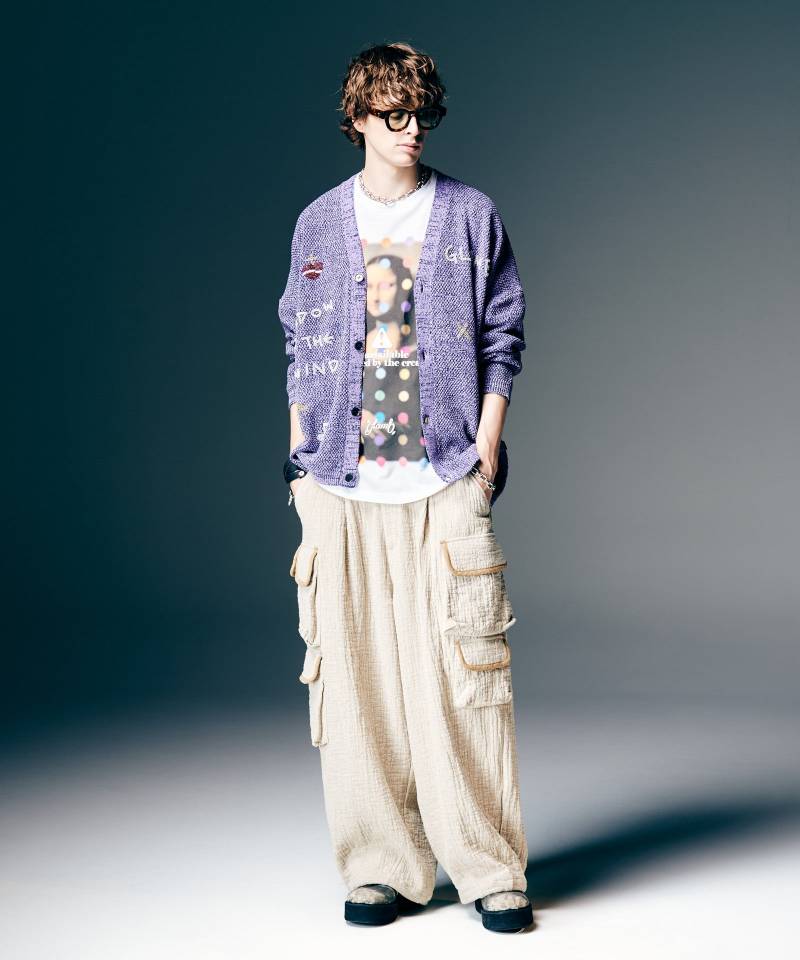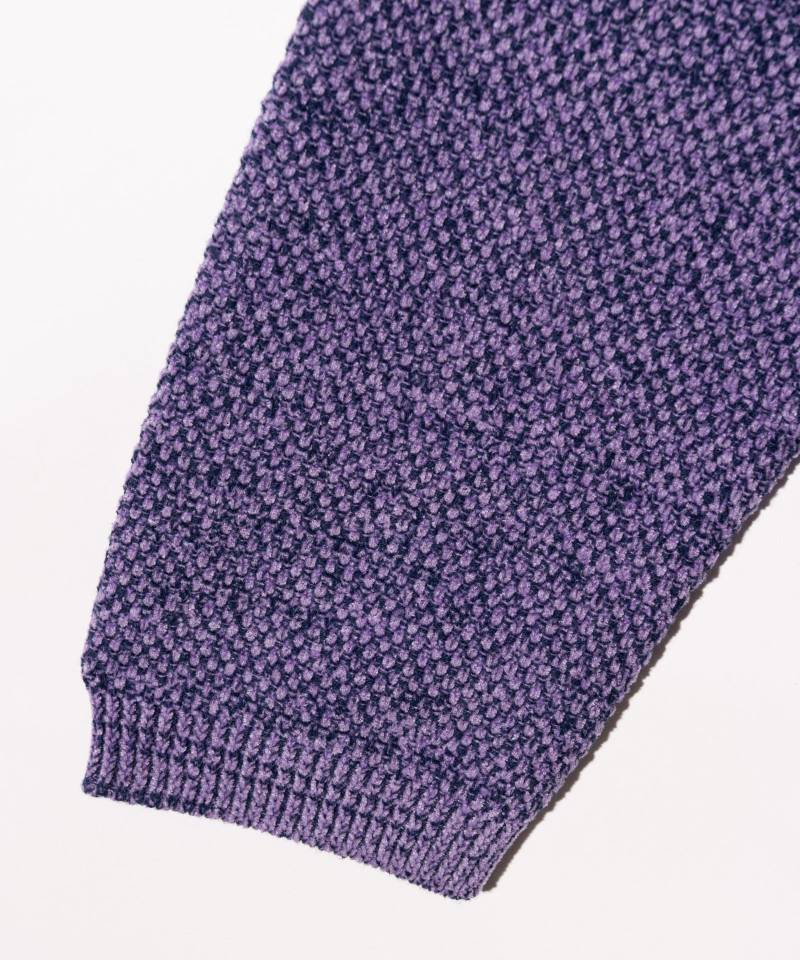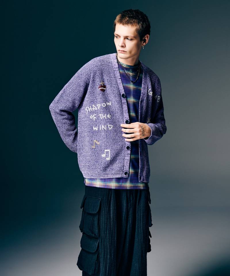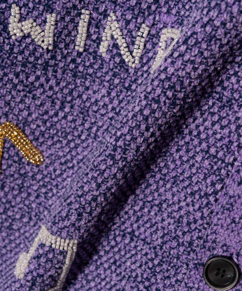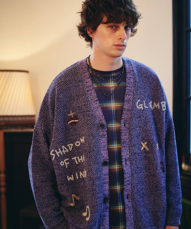 音楽をインスピレーションの根底に抱くglambが、アナログの温もりをデザインに落とし込んだHand Beaded Cardiganをリリース。凹凸ある表情のボディは鹿の子編み仕立て。ふんわりとした毛足のモール糸とシャープな高撚綿糸を合わせることで、深みのあるテクスチャを生み出しています。そこに散りばめたのが職人が施したビーズ刺繍。きらびやかな落書き調のタッチでラグジュアリーとリラックスが同居した佇まいを生み出しました。シルエットはレギュラー丈の着丈にゆとりある身幅を組み合わせたルーズサイズ。BlackとMintは単色、Purpleは杢調とカラーバリエーションに異なる表情となっています。
