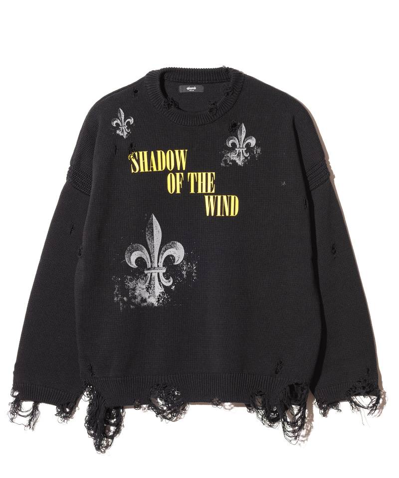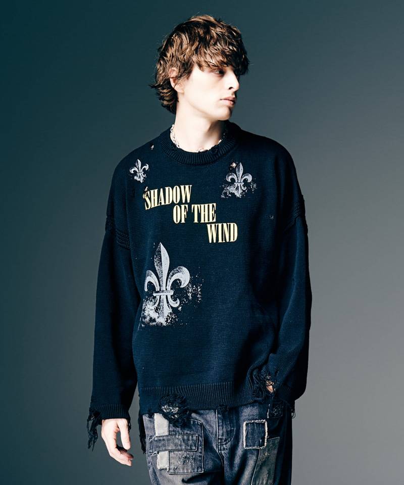 “Shadow of the Wind”をテーマに掲げて世界の光と陰をワードローブに描き出す今季、プルオーバーニットにギャップあるデザインを落とし込んだSacred Damage Knit。ボディの柄使いは百合の紋章をあしらったクラシカルなものながら、その要所へハードなダメージ加工。紋章自体もかすれの表現を加えることで貴族的なモチーフとストリートのミクスチャーを生み出しています。素材に用いたのはコットン100%の双糸。ボディは天竺編み、首周りと袖口、裾はリブ編み、アームホールは片畦編みとニットならではのテクスチャ変化も魅力です。