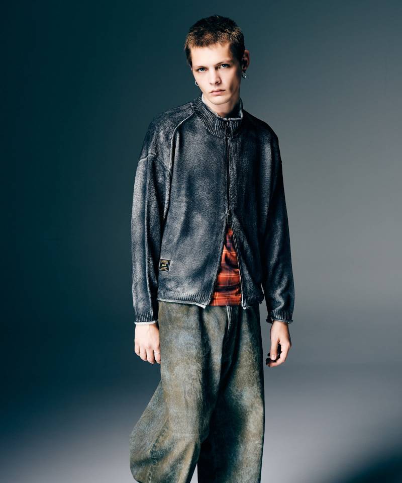 ニットマテリアルにワークウェアのエッセンスを掛け合わせて真新しいテクスチャを生み出したParaffin Coated Knit Blouson。モックネックを備えたボックスシルエットのボディは柔らかな肌触りのアクリルリリーヤーンを天竺編みしたもの。仕上げに国内のファクトリーでパラフィン樹脂をスプレー、丹念なハンドプレスを施して、オイルドジャケットのような艶をまとわせました。着込むほどに表面加工がこなれていく経年変化も本加工の魅力。大ぶりなフロントジップもラギッドなムードを強調しながら、肩線をフロントに出すことでニットならではの表情も持たせました。