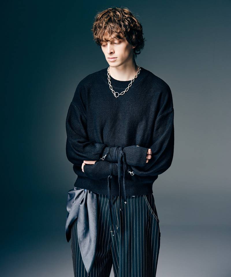 緩急あるシルエットメイキングでプルオーバーニットを再構築したCreed Knitが今季ならではの意匠を備えて登場。ミドルゲージの天竺裏目使いで仕立てたボディは従来よりもショート丈としたボックスシルエット。ロングリブで緩急ある輪郭にまとめたアームは袖口にサムホールを、さらに新たなギミックとしてニットテープを配しました。こちらはそのまま垂らしたり、リブに巻いてロックスタイルにしたりとアレンジが可能。今季のアクセサリーラインで用意されるストラップシリーズ(*)のさらなる重ね付けもブランドからの提案です。