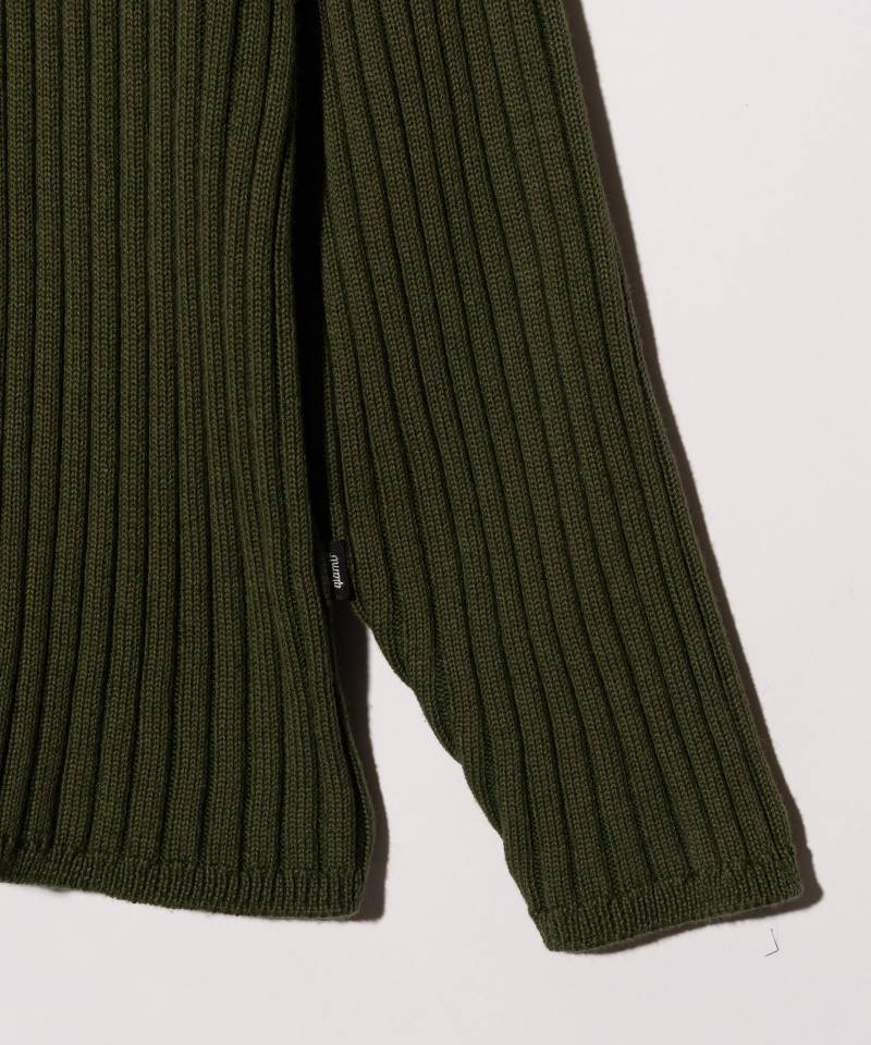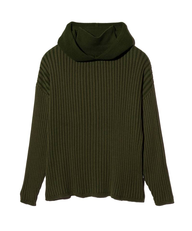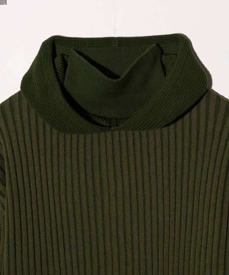 ニットならではの技法を駆使して真新しいプルオーバースタイルを提案するStripe Rib Knit Hoodie。ボディはアクリルコットン糸を2重臼のワイドリブに編み立てた複雑なテクスチャ。配色の2本の糸を同時に引き入れながら編むことで、表と裏にそれぞれの色を見せて描き出しました。その首元にあしらわれたのは畦編みのフードとリブ編みのハイネックのレイヤード。シルエットは着丈を短めに設定したルーズフィットとなっており今季らしいスタイリングのバランスを提案します。