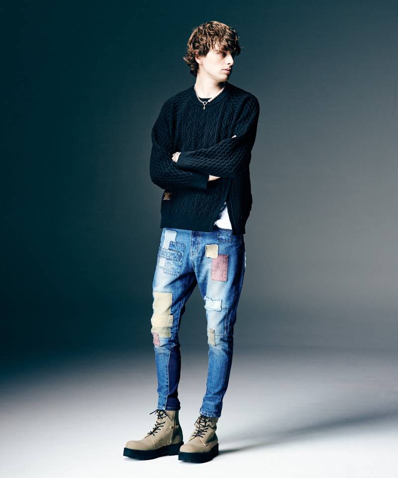 glambが得意とするクレイジーパターンに巧みなニッティングを落とし込んだAsymmetry Cable Knit。ラグランスリーブにランダムな切り替えを施した身頃は、アラン編みに用いられるケーブル柄とハニカム柄をパーツごとに使い分け。さらにフロント左側には斜めのスリットを入れてアシンメトリーなデザインを強調します。ボディは着丈をコンパクトに設けたボックススリーブ。Blackは同系色でモードに、Navyは配色のパーツでカラフルに、カラーバリエーションによって異なるムードをお楽しみください。