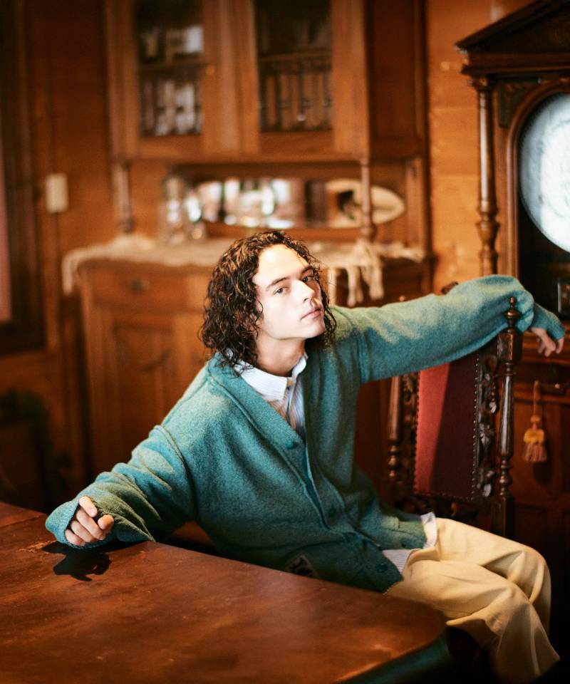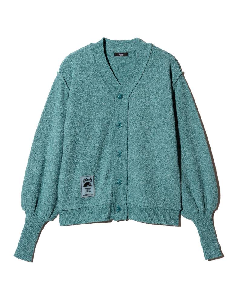 glambの人気シリーズの一つ、Creed Knitのエッセンスをカーディガンに落とし込んだCreed Cardigan。アームにコントラストあるシルエットを描き出すのはサムホールを備えたロングリブの袖口。ワイドな袖が手元に溜まり、エレガントなボリュームを形作ります。アームホールや前立てでは縫い代を表に出して立体感あるテクスチャ変化を描出。右裾にクリア素材のラバータグをあしらってアクセントを添えました。テキスタイルに用いたのは、ドライタッチのブークレ糸をミドルゲージで天竺裏目使いしたマテリアル。糸の輪を表に出すことで独特のラフな質感を見せています。シルエットは着丈短めのルーズフィット。Vネックを浅めに取ることでカジュアルに寄り過ぎないバランスを持たせています。