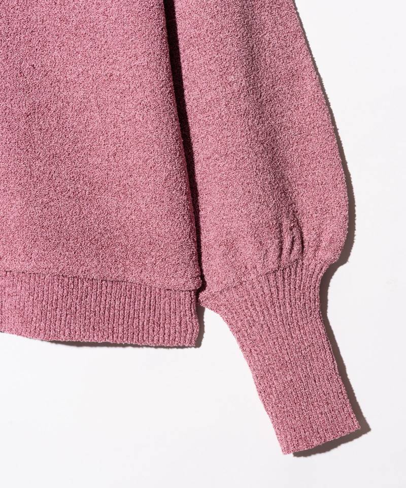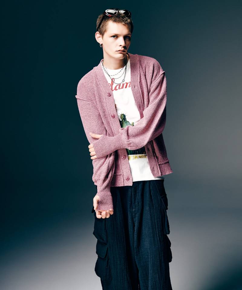 glambの人気シリーズの一つ、Creed Knitのエッセンスをカーディガンに落とし込んだCreed Cardigan。アームにコントラストあるシルエットを描き出すのはサムホールを備えたロングリブの袖口。ワイドな袖が手元に溜まり、エレガントなボリュームを形作ります。アームホールや前立てでは縫い代を表に出して立体感あるテクスチャ変化を描出。右裾にクリア素材のラバータグをあしらってアクセントを添えました。テキスタイルに用いたのは、ドライタッチのブークレ糸をミドルゲージで天竺裏目使いしたマテリアル。糸の輪を表に出すことで独特のラフな質感を見せています。シルエットは着丈短めのルーズフィット。Vネックを浅めに取ることでカジュアルに寄り過ぎないバランスを持たせています。