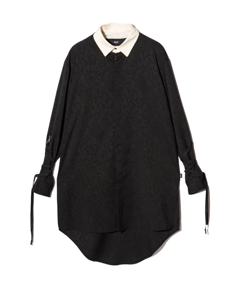 “Shadow of the Wind”をコレクションテーマに掲げた今季のglamb。その世界観を素材とディテール、シルエットの三位一体によって表現したBlow Long Shirt。ボディは着丈に前後差を付けてサイドスリットを加えたロングシルエット。身生地にアダルトな陰影を生み出すシャドーマーブル柄のテキスタイルを用いて仕立てました。さらに本作のコンセプトを強調するのは両袖にあしらわれた70cmのロングテープ。風を受けて揺らめくエアリーな動きを視覚的に表現します。それらの意匠の数々に呼応するのが首元のフェイクレイヤード。ラウンドネックとスタンドカラーを組み合わせたネックラインが神秘的な佇まいを生み出します。今季のアクセサリーラインで用意されるストラップシリーズ(*)のさらなる重ね付けもブランドからの提案です。
