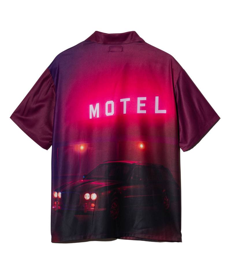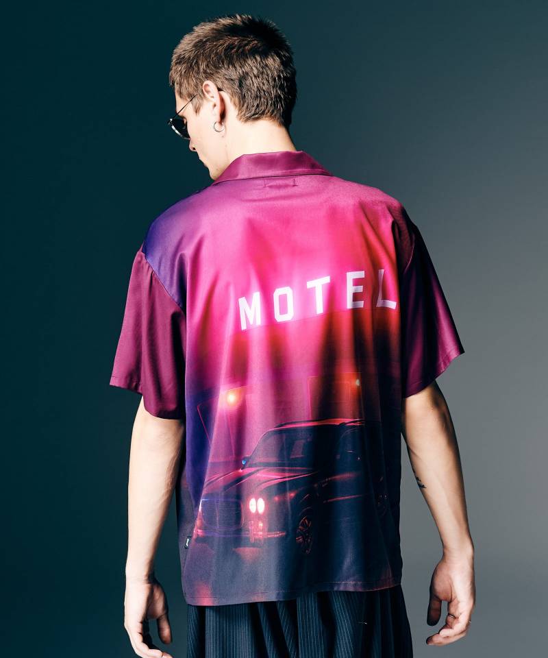 きらめく夜景を大胆なレイアウトでオープンカラーに落とし込み、アダルトなムードに仕立て上げたMidnight Open Collar Shirt。ボディは身幅と着丈にゆとりを持たせたルーズなボックスシルエット。身頃全体への大胆なプリントによってBlackには雨粒が滲ませた街の夜景、Redはネオンが照らすモーテルの夜更けを描きました。テキスタイルは深い黒の色調を生み出すよう光沢にこだわってブランドが選定したテキスタイルを使用。春夏のスタイリングをトップスだけで完成させる存在感を持った1枚です。