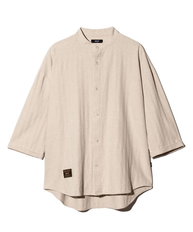 ヴィンテージミリタリーウェアを着想にセレクトしたテキスタイルをミニマルなデザインで提案するStand Collar Shirt。洗練されたスタンドカラーのボディは身幅にゆとりを持たせ、着丈に前後差をつけたオーバーサイズ。ドロップショルダーのアームはレングスを五分袖、袖口をダブル仕様にすることで下側に重心を持たせた変化あるシルエットとなっています。そこに落とし込んだのはシャリ感があり清涼感のある肌触りが魅力となるリネン混ヘリンボーン生地を使用。モックネック調のデザインと相まってリラックスしたアーバンスタイリングを生み出します。