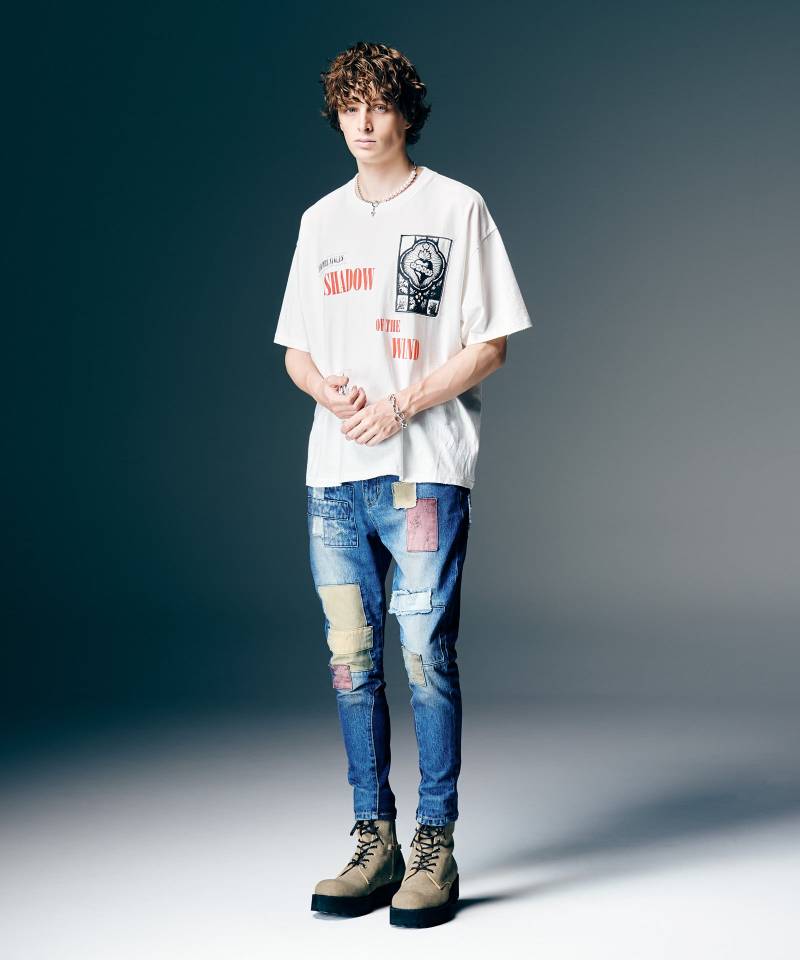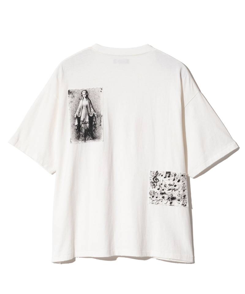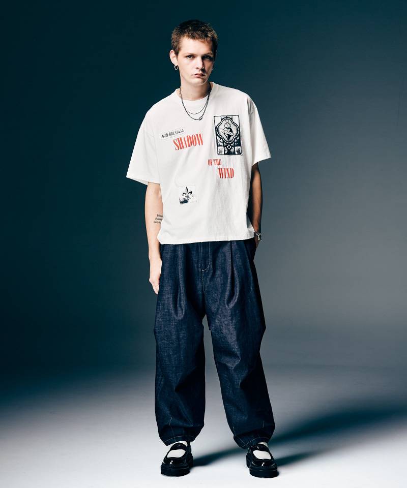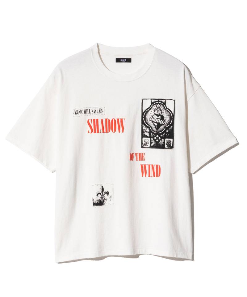 “Shadow of the Wind”をテーマに掲げる今季、光と陰のミステリアスな世界観を迫真のヴィンテージクラフトで具現化したSacred Damage Cutsew。フロントに当て布であしらったのは神秘的な柄使い。そこにテーマのタイポグラフィをアクセントカラーの発泡プリントであしらって荘厳なムードをまとわせています。バックスタイルに配したのは楽譜やヘッドフォンをかけたマリアモチーフ。音楽へのリスペクトをデザインに昇華するglambらしいルックを作り上げました。ドライなヴィンテージタッチを持ったコットン生地を使用したボディは独自のウォッシュ加工によって経年変化の風合いを演出。袖口と裾は90年代以前のTシャツに見られるシングルステッチで仕上げ、そのムードにさらなるリアリティを与えています。仕上げに手作業によって随所にダメージも加えることでヴィンテージの面持ちが完成。シルエットは広めの身幅と短めの着丈をかけ合わせたルーズフィットとなっております。