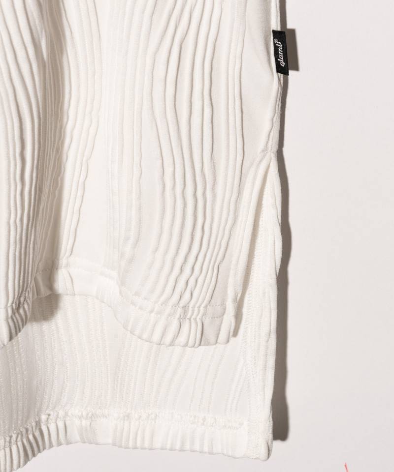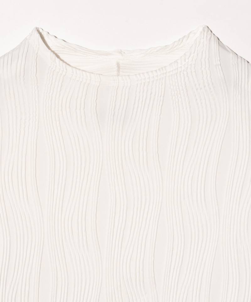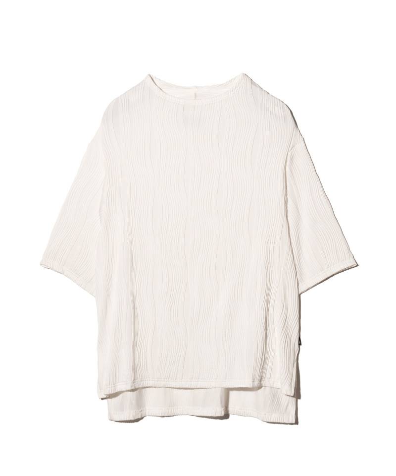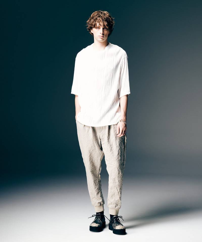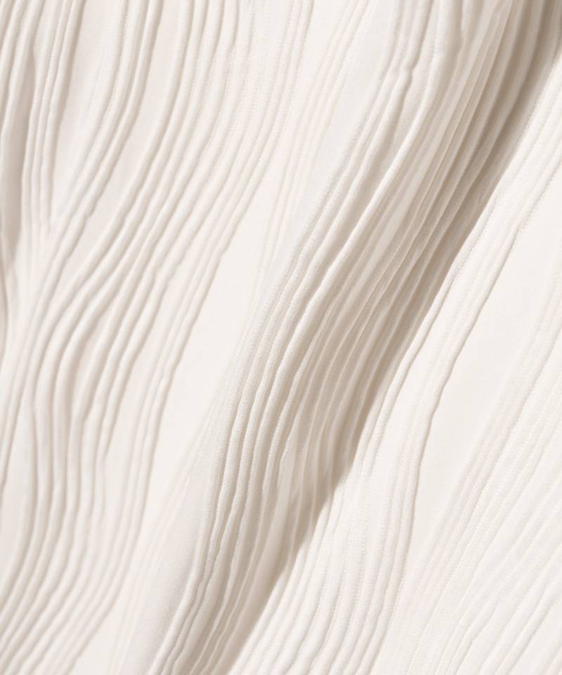 凹凸感のある表情豊かなテキスタイルがエレガントな佇まいをもたらす“Willow Crepe”シリーズの新作が今春登場。テキスタイルに用いたのは凹凸のある流線形のタックが刻まれた楊柳調生地。編み針で網目を作り、さらに編み地に結び付けるという丹念な工程によって奥行のある畝を形作っています。胸位置に生まれるドレープは、前身頃をワイドに設定して前下がりを持たせることでドレープを構築。ネックラインは背面側をやや高めに設定することにより、より一層ボリュームを演出します。身幅にゆとり、着丈に前後差を設けたボディはリラックスフィットながら動きあるシルエットを表現。ボトムスを選ばずスタイリングを整えてくれる一枚です。セットアップでWillow Crepe Pantsも展開、ブランドが提案するコンセプチュアルな着こなしにもぜひチャレンジを。