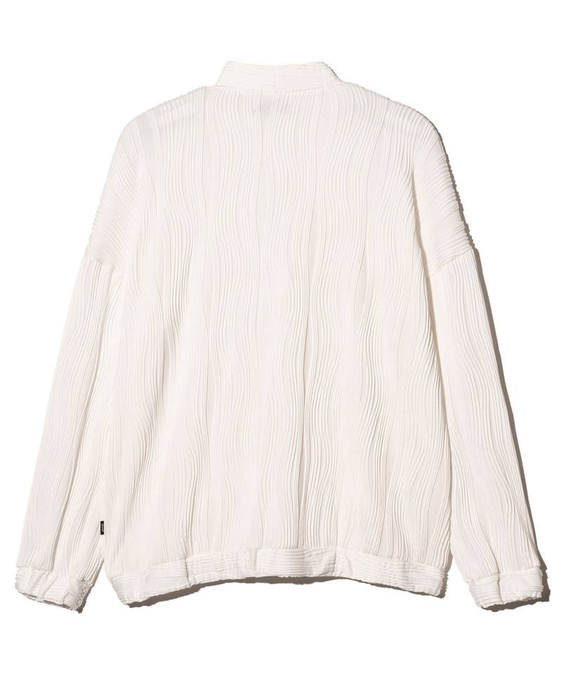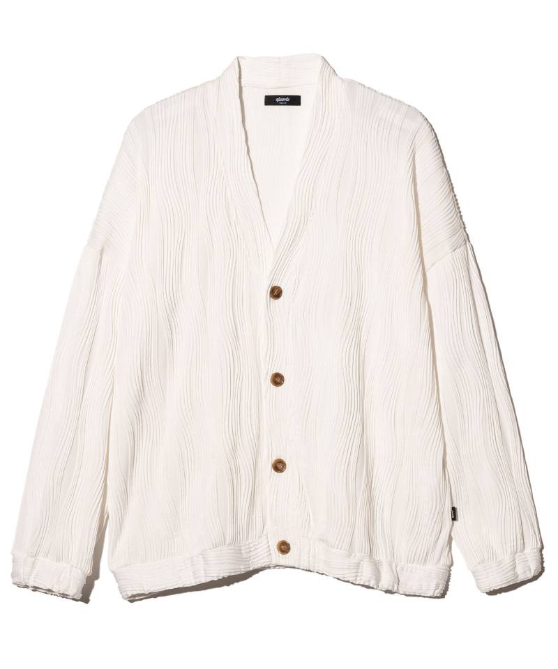 glambの人気カットソー“Willow Crepe”をカーディガンスタイルで提案するWillow Crepe Cardigan。素材に用いたのは凹凸のある流線形のタックが刻まれた生地。編み針で網目を作り、さらに編み地に結び付けるという丹念な工程によって奥行のある畝を形作っています。コンパクトに設計されたシルエットはシャツやTシャツの上から羽織ってももたつかず、エッジィな印象。Willow Crepe Pantsとセットアップでの展開となりますが、単体でもシーズンレスに幅広いスタイリングへ対応します。