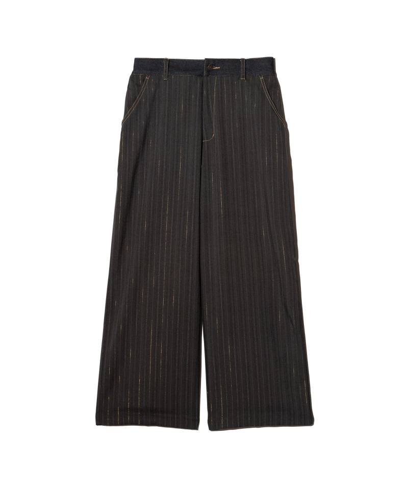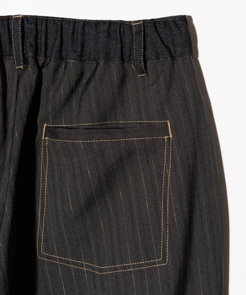 スタイリング提案を込めたディテール使いを随所に落とし込み、ワークとトラッドをウィットあるバランスで融合したDenim Combination Slacks。ワイドシルエットのボディは、光沢糸をライン部分に織り込んだロックマインドあるストライプ生地を使用。ウエストのデニム切り替えやバックポケットにあしらわれたデニムを模したステッチなど、ワークのディテールを散りばめることでジャンルレスなヴィジュアルにまとめました。スタイリングはトップスをタックインして異素材使いを強調したアレンジがブランドからの提案。アヴァンギャルドでありながらリアルな本作独自のバランス感をお楽しみください。